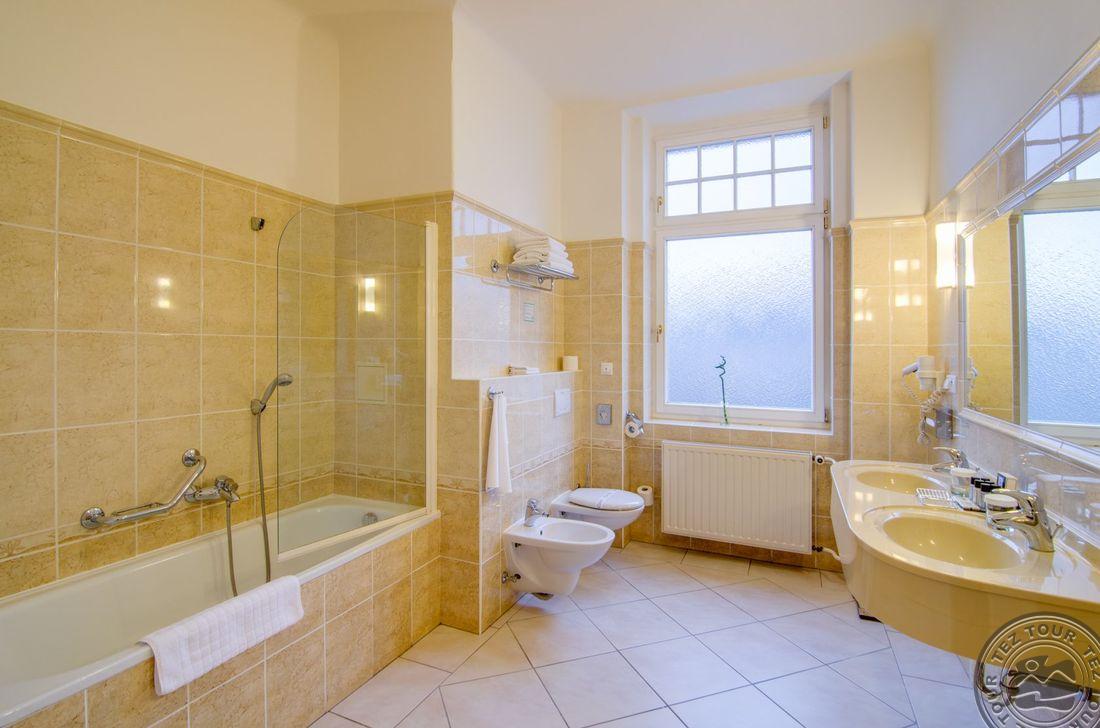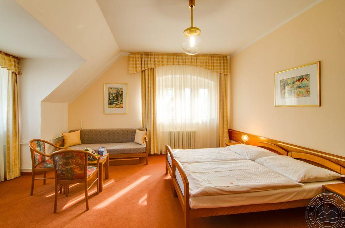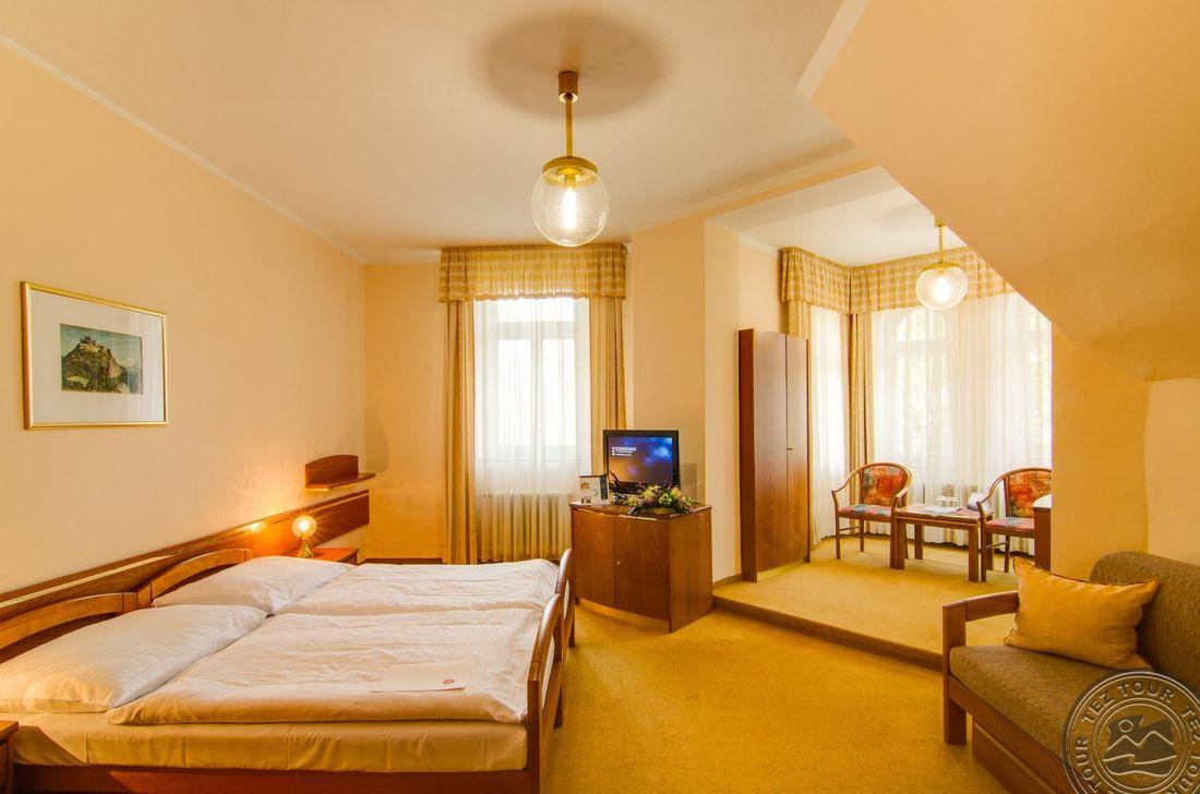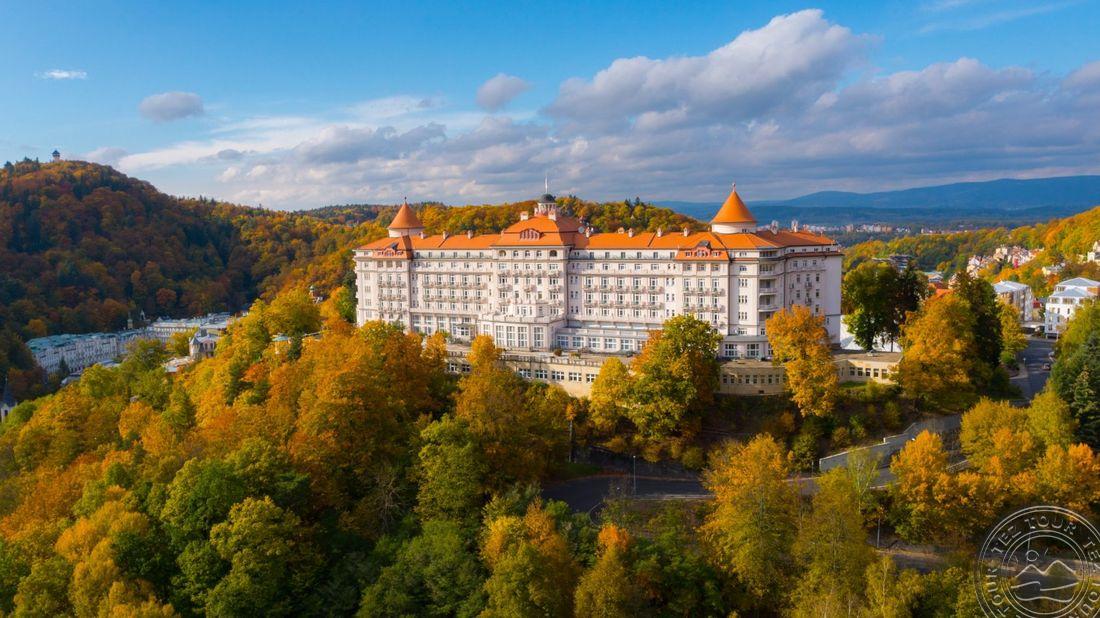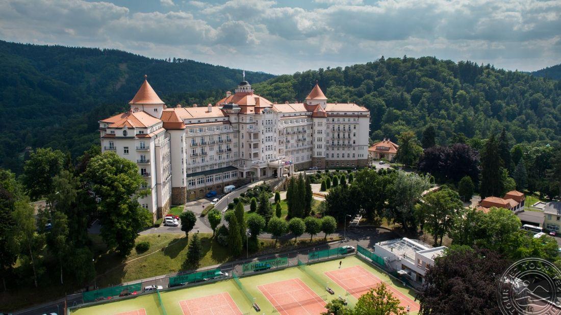 в живописном месте курорта Карловы Вары, на возвышенности, посреди собственного парка с теннисными кортами и удобной транспортной доступностью до центра города – фуникулер и автобус.