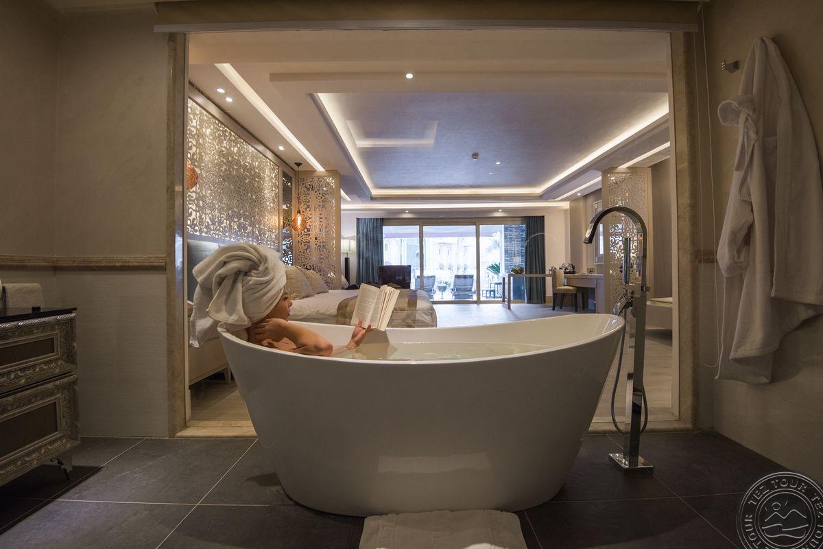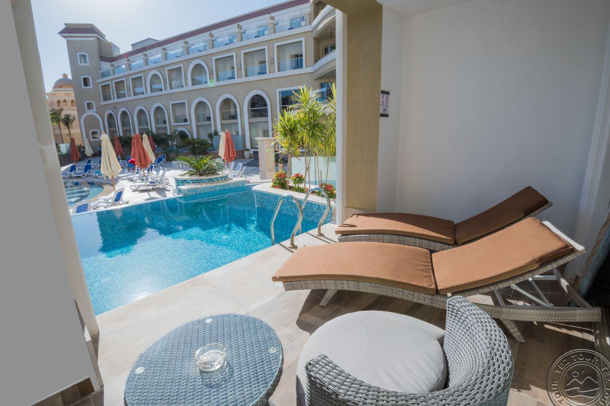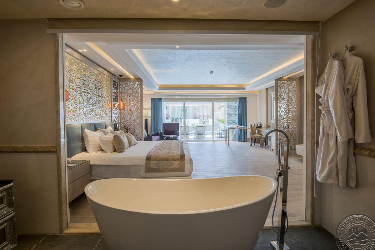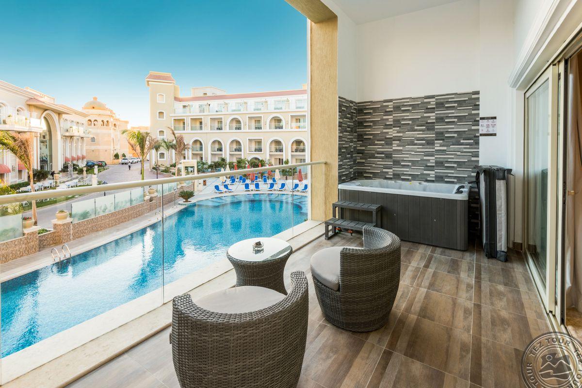 Jacuzzi Suite PV (Pool view, 90 м2, спальня с Super King size bed и гостинной зоной, включая ванную, джакузи и балкон),