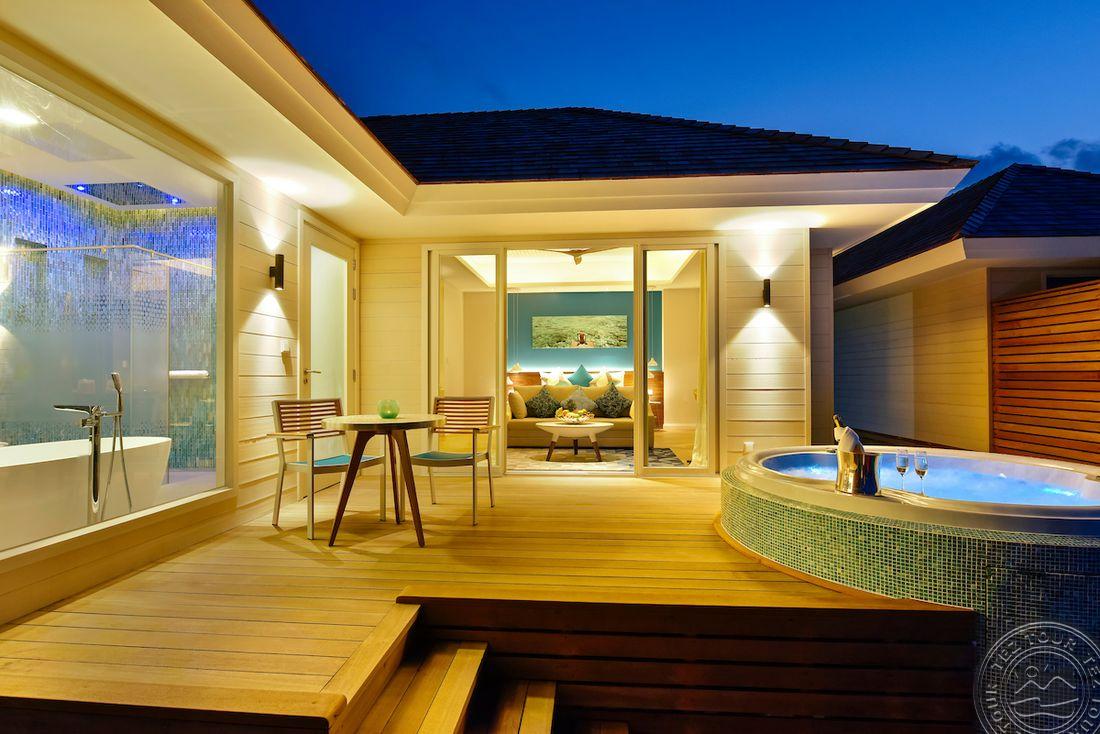 15 Aqua Villa with Swirlpool (48 м2 – внутренние помещения/ 25 м2 – внешние, макс. 4 или 2+2 чел.). По наполнению идентичны номерам Aqua Villa, но дополнительно имеют джакузи на террасе.