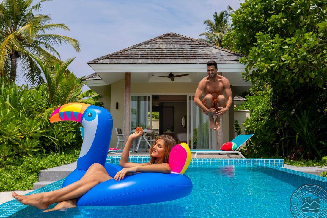 23 Sunset Beach Pool Villa with Swirlpool (55 м2 – внутренние помещения/ 50 м2 – внешние, макс. 4 или 2+2 чел.). По наполнению идентичны номерам Sunrise Beach Pool Villa with Swirlpool, но имеют вид на закат.
