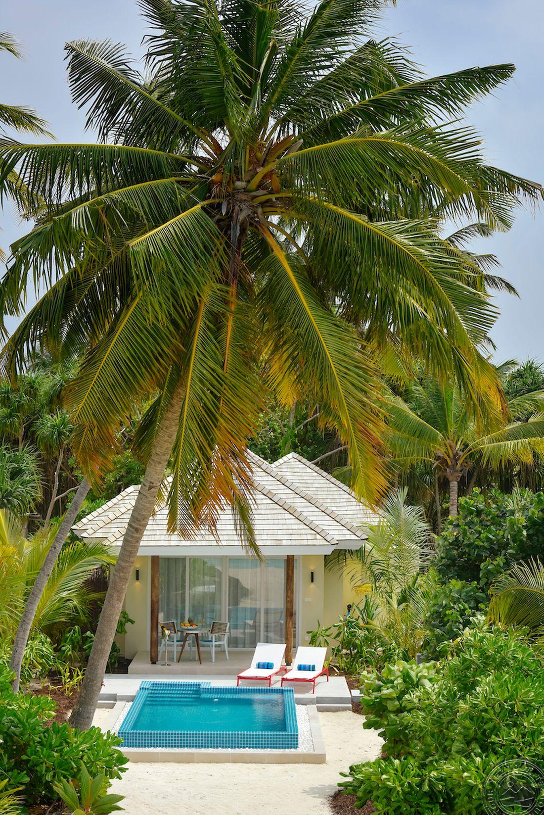 18 Beach Villa with Swirlpool (55 м2 – внутренние помещения/ 42 м2 – внешние, макс. 4 или 2+2 чел.). Береговые виллы с видом на лагуну и индивидуальным выходом на пляж. Спальня с кроватью king-size, зона отдыха с диваном, гардеробная, частично открытая ванная комната с ванной, душевой кабиной и тропическим душем, кушетка для отдыха, джакузи, терраса с обеденным столиком и шезлонгами.