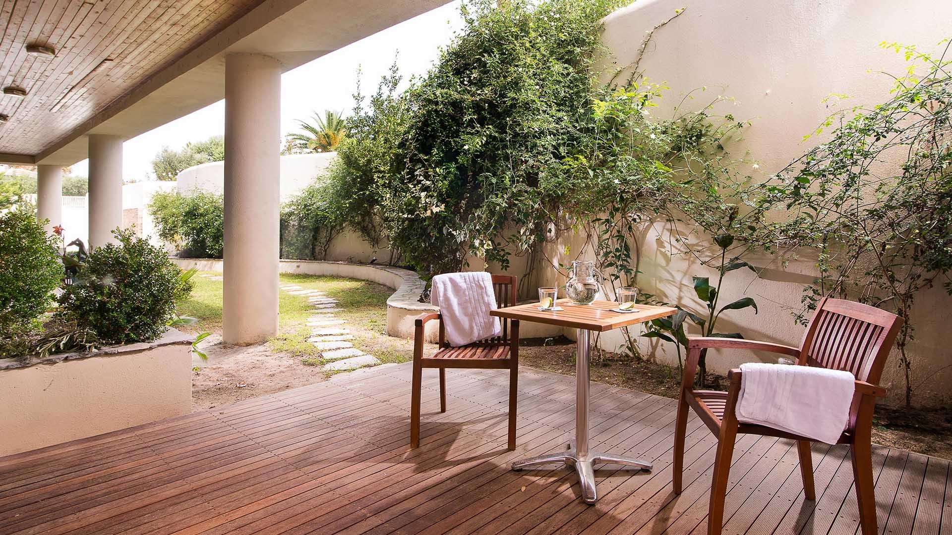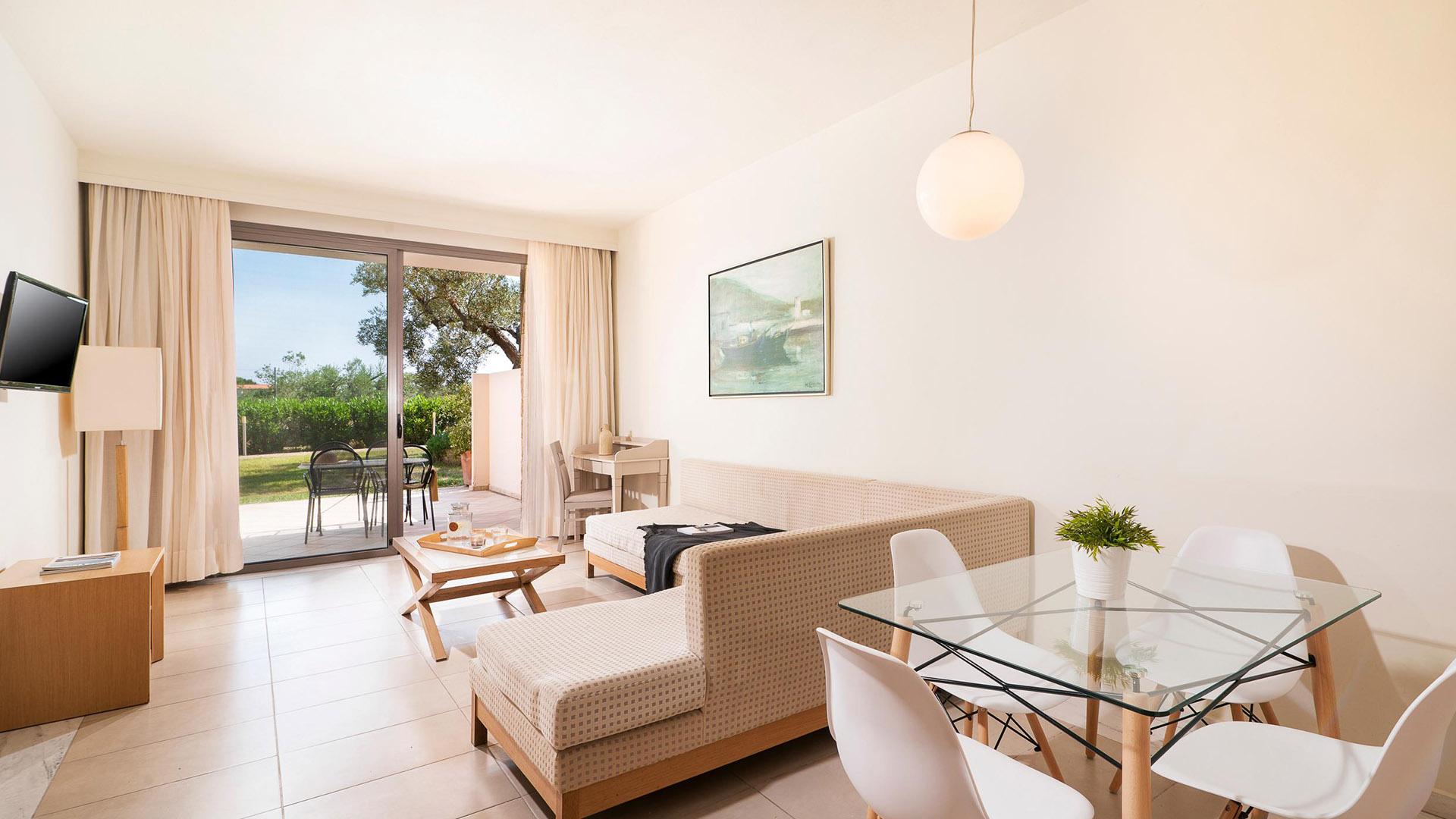 - FAMILY SUITE WITH GARDEN ACCESS – 50 кв.м (макс. 4+1): номер находится на 1-м этаже; спальня с 1 двуспальной либо 2 односпальными кроватями и прямым доступом в пышный сад, отдельная гостиная с 2 диванами-кроватями, ванная комната с ванной и раздельной душевой, оборудованная терраса с видом на сад