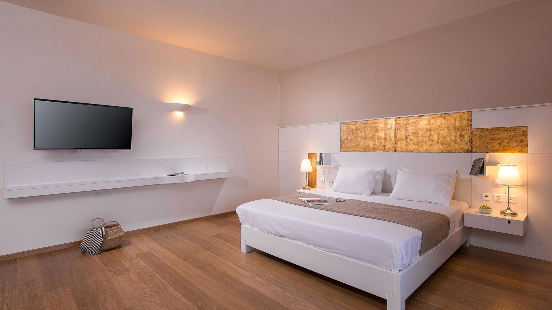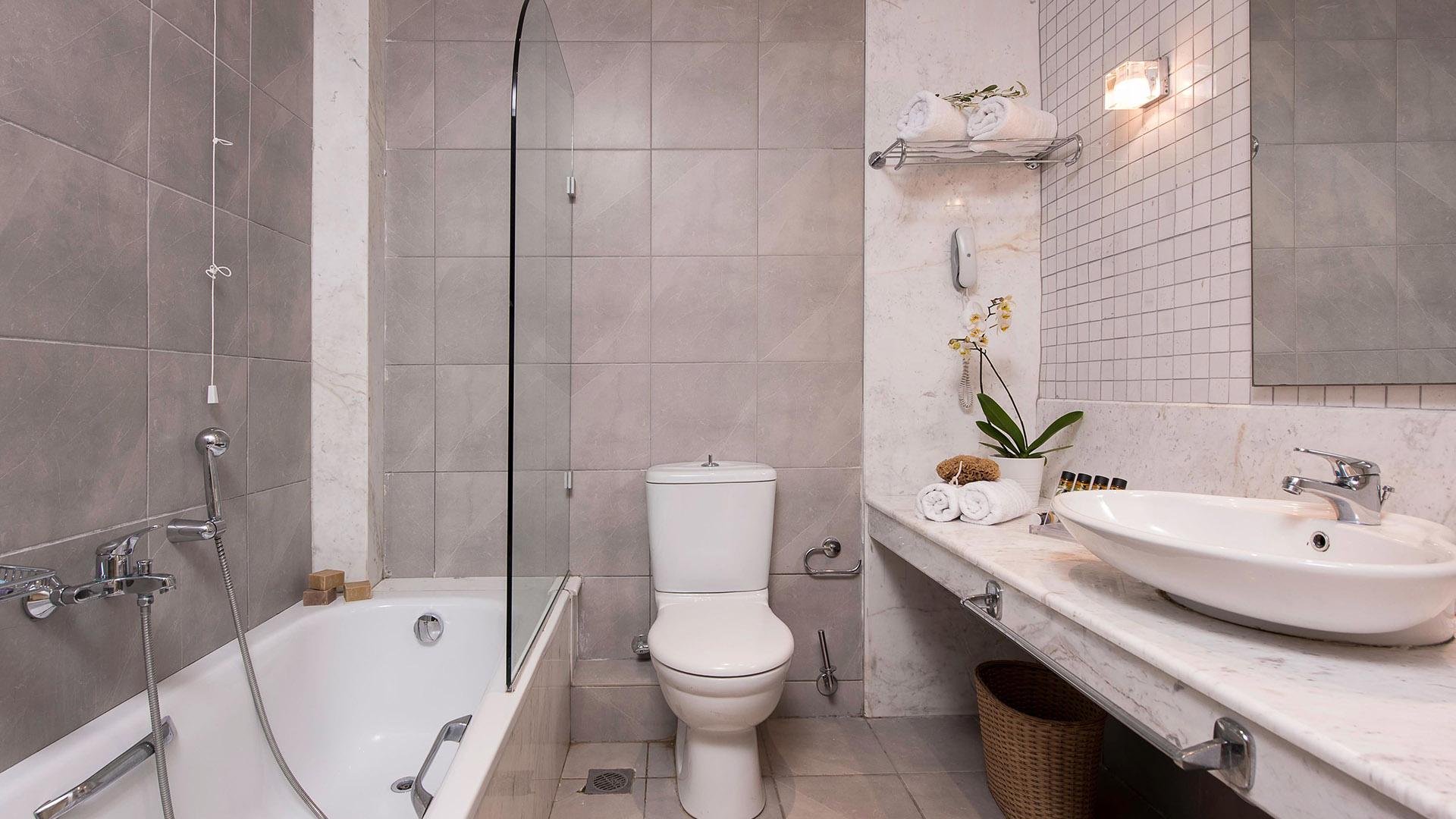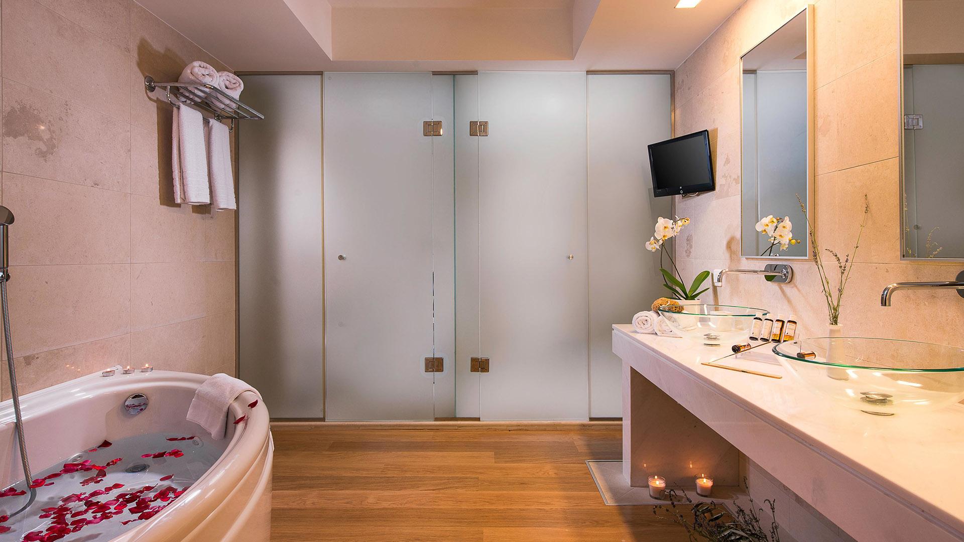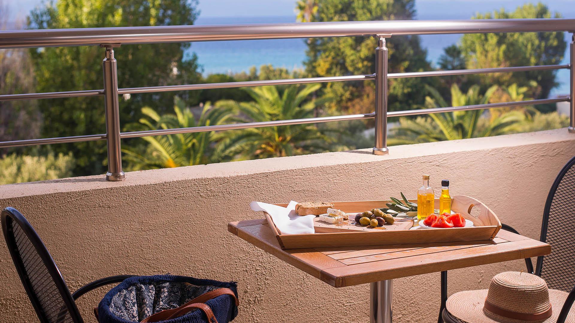 - GRAND SUITE SEA VIEW – 60 кв.м (макс. 2): верхний этаж главного корпуса; спальня с двуспальной кроватью, отдельная гостиная с диваном, ванная комната с угловым джакузи и отдельной душевой кабинкой, оборудованный балкон с видом на море