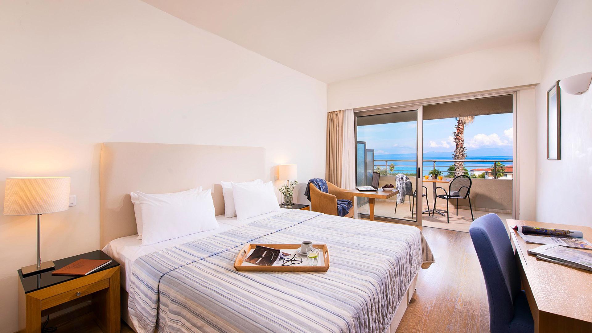 - DELUXE ROOM SIDE SEA VIEW – 27 кв.м (макс. 3): главный корпус; номер с двуспальной либо 2 односпальными кроватями, диван-кровать, ванная комната с ванной, оборудованный балкон с боковым видом на море