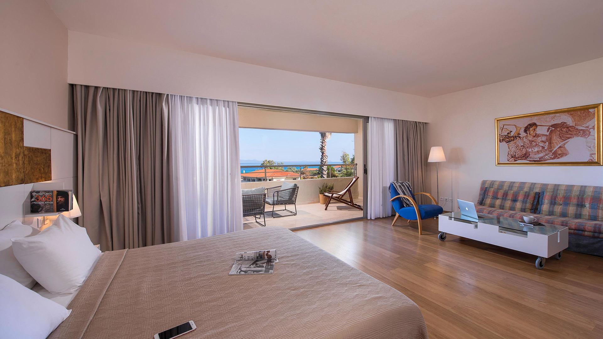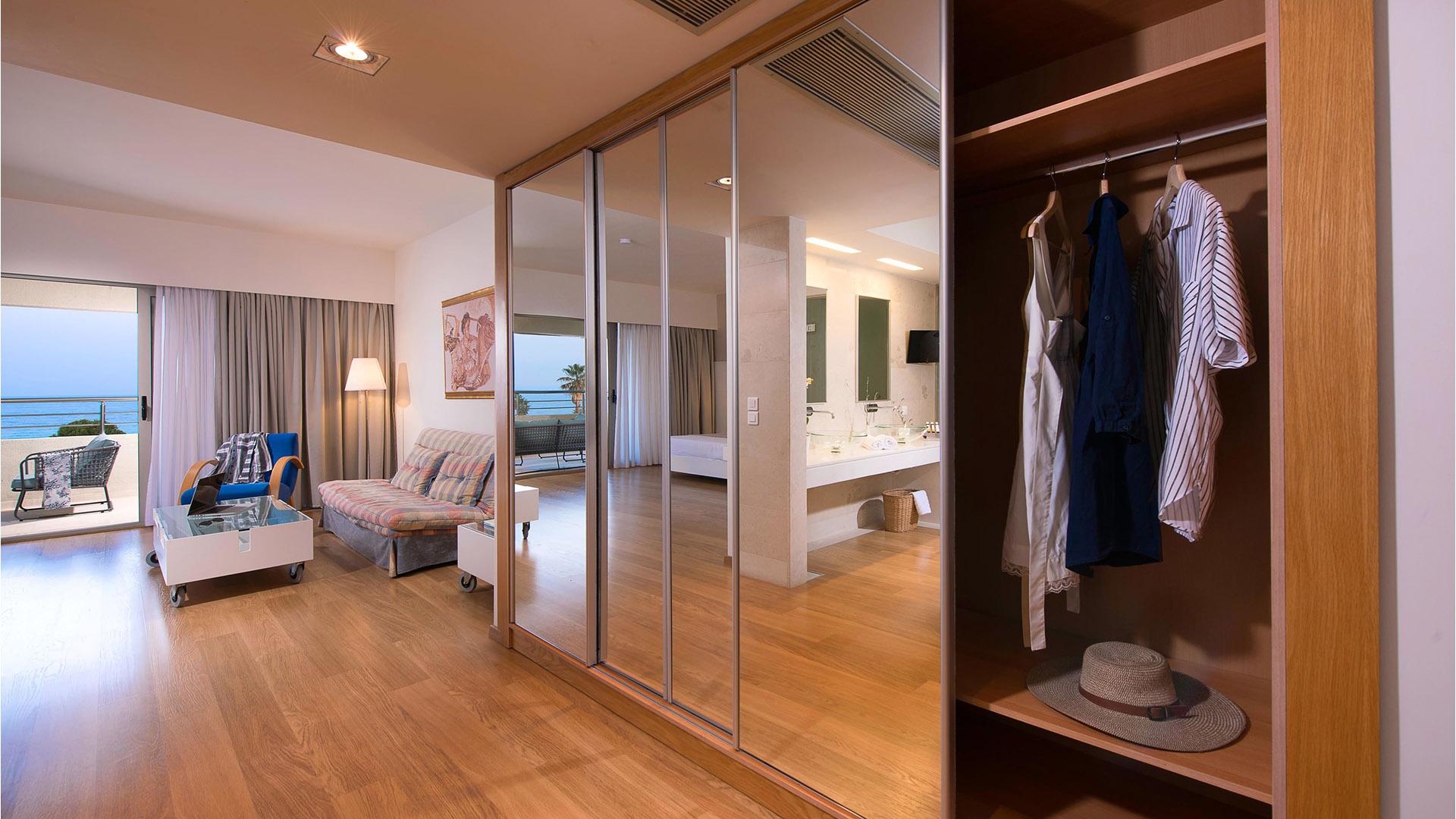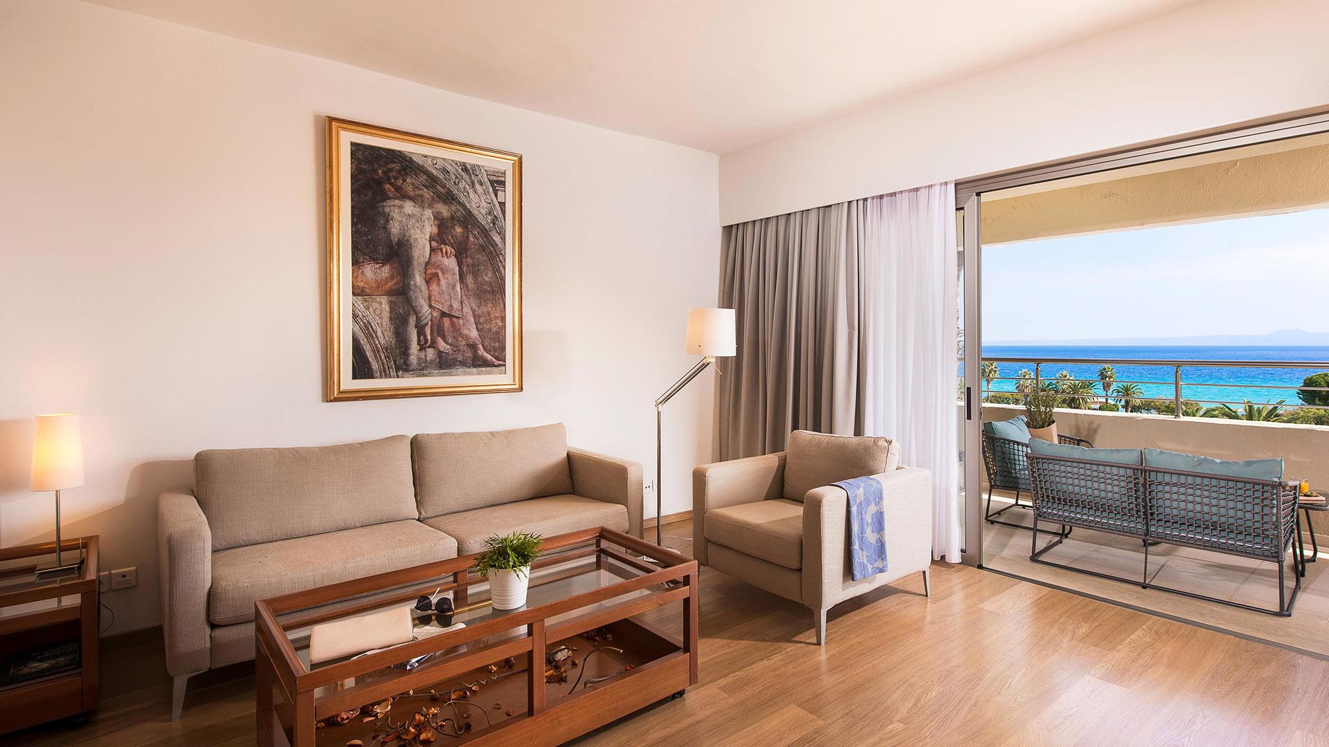 - FAMILY SUITE SEA VIEW – 50 кв.м (макс. 4): спальня с двуспальной либо 2 односпальными кроватями, отдельная гостиная с 2 диванами-кроватями, ванная комната с ванной и раздельной душевой, оборудованный балкон с видом на море