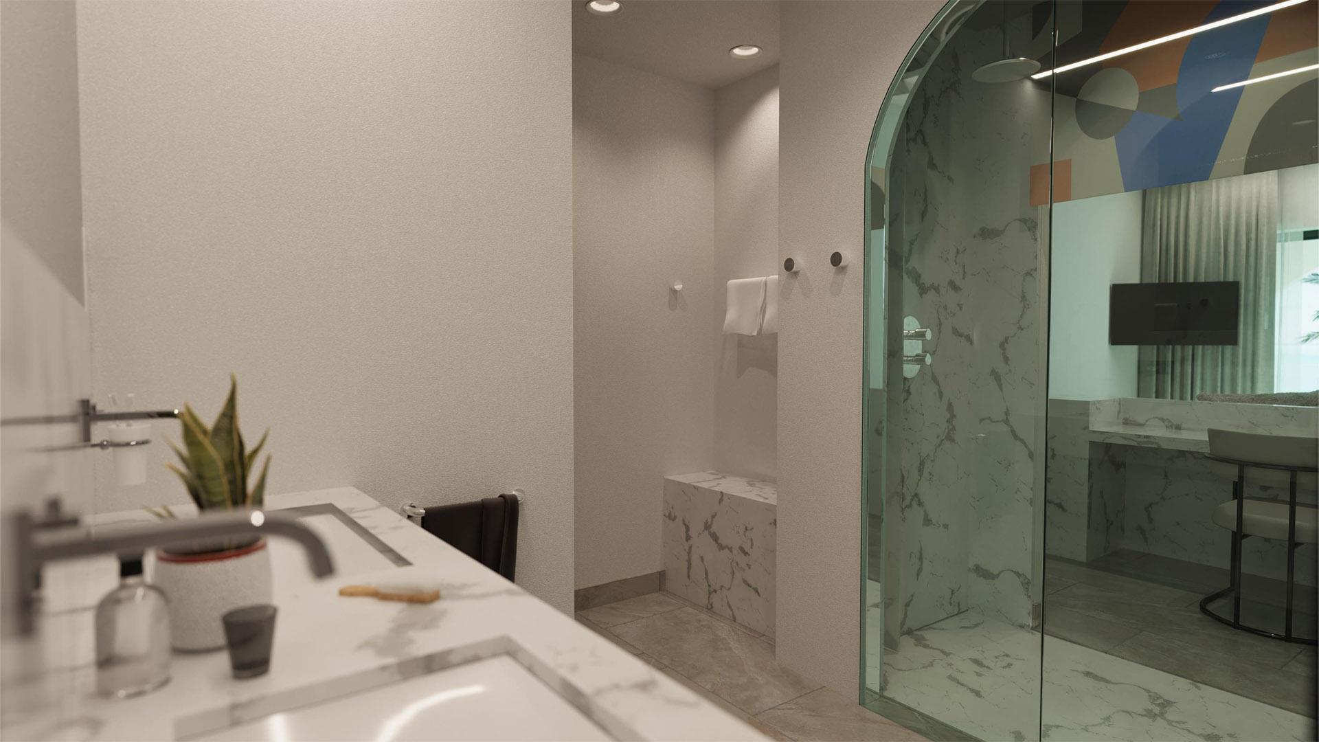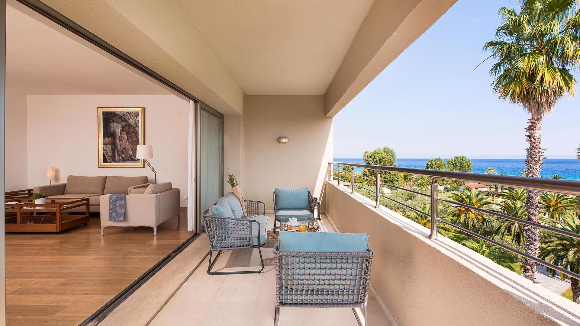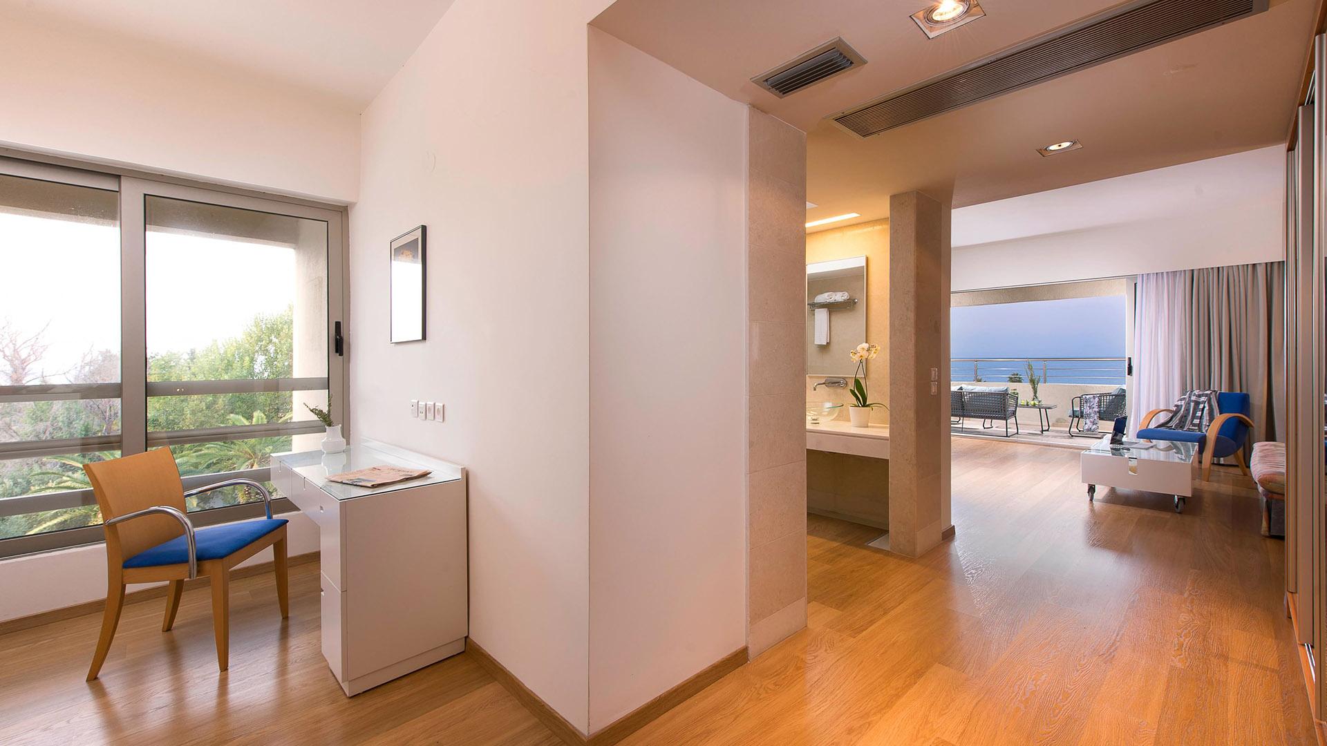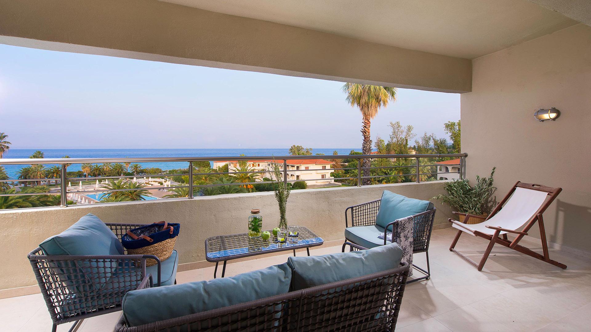 - FAMILY SUITE SEA VIEW – 50 кв.м (макс. 4): спальня с двуспальной либо 2 односпальными кроватями, отдельная гостиная с 2 диванами-кроватями, ванная комната с ванной и раздельной душевой, оборудованный балкон с видом на море