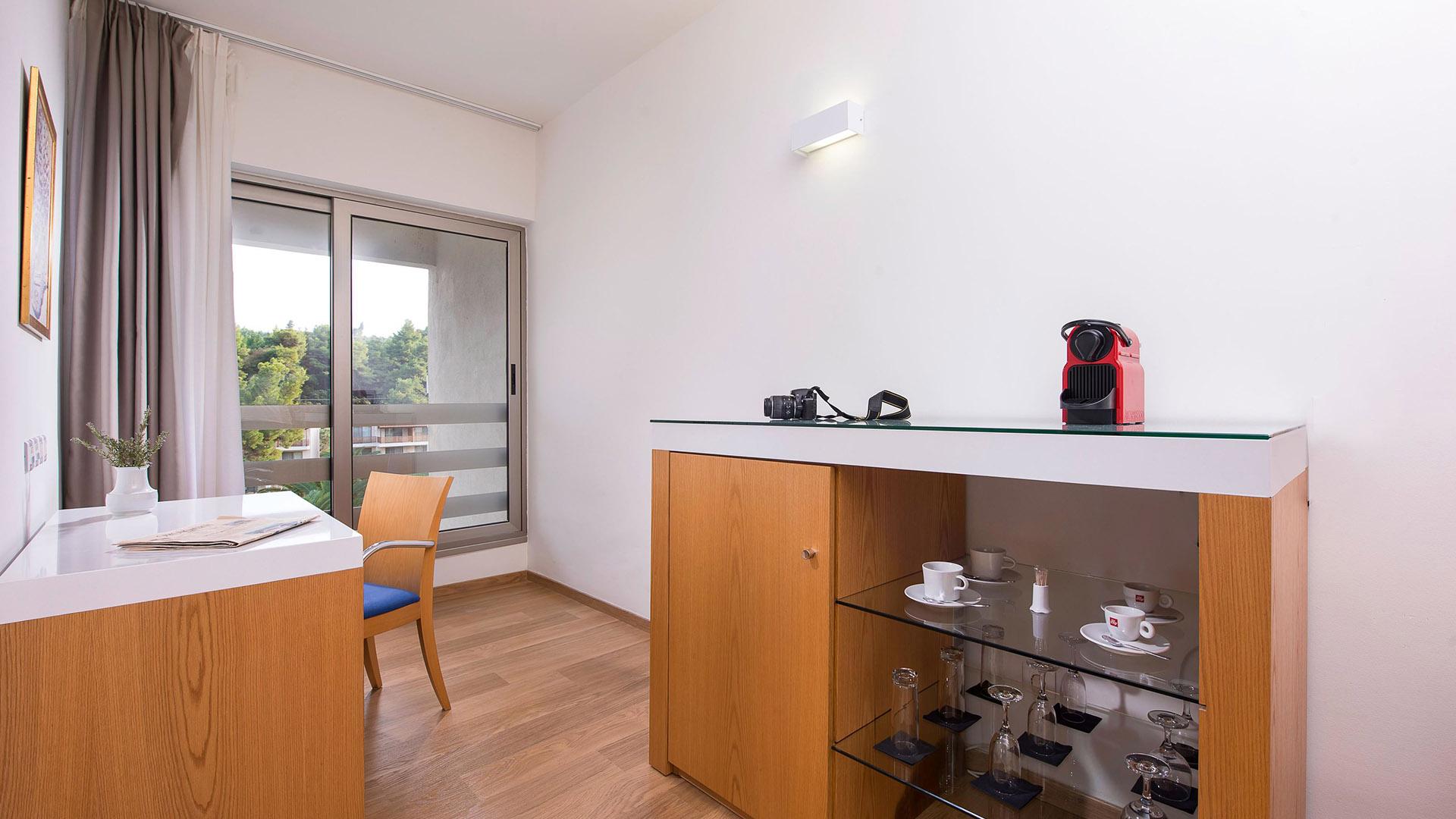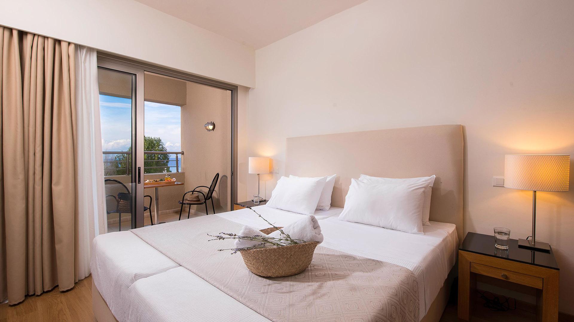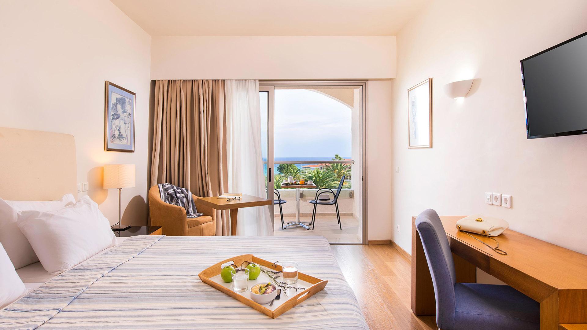 - SUITE ONE BEDROOM SEA VIEW – 50 кв.м (макс. 4): реновированный номер; спальня с двуспальной либо 2 односпальными кроватями, отдельная гостиная с 2 диванами-кроватями, ванная комната с душем, оборудованный балкон с видом на море
