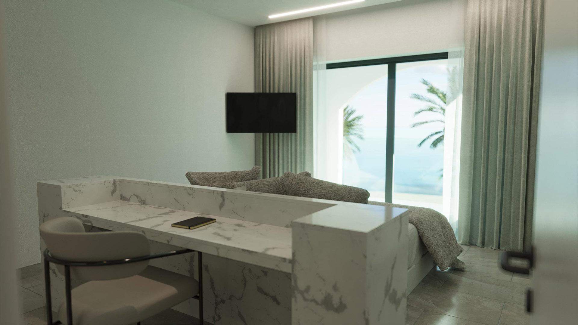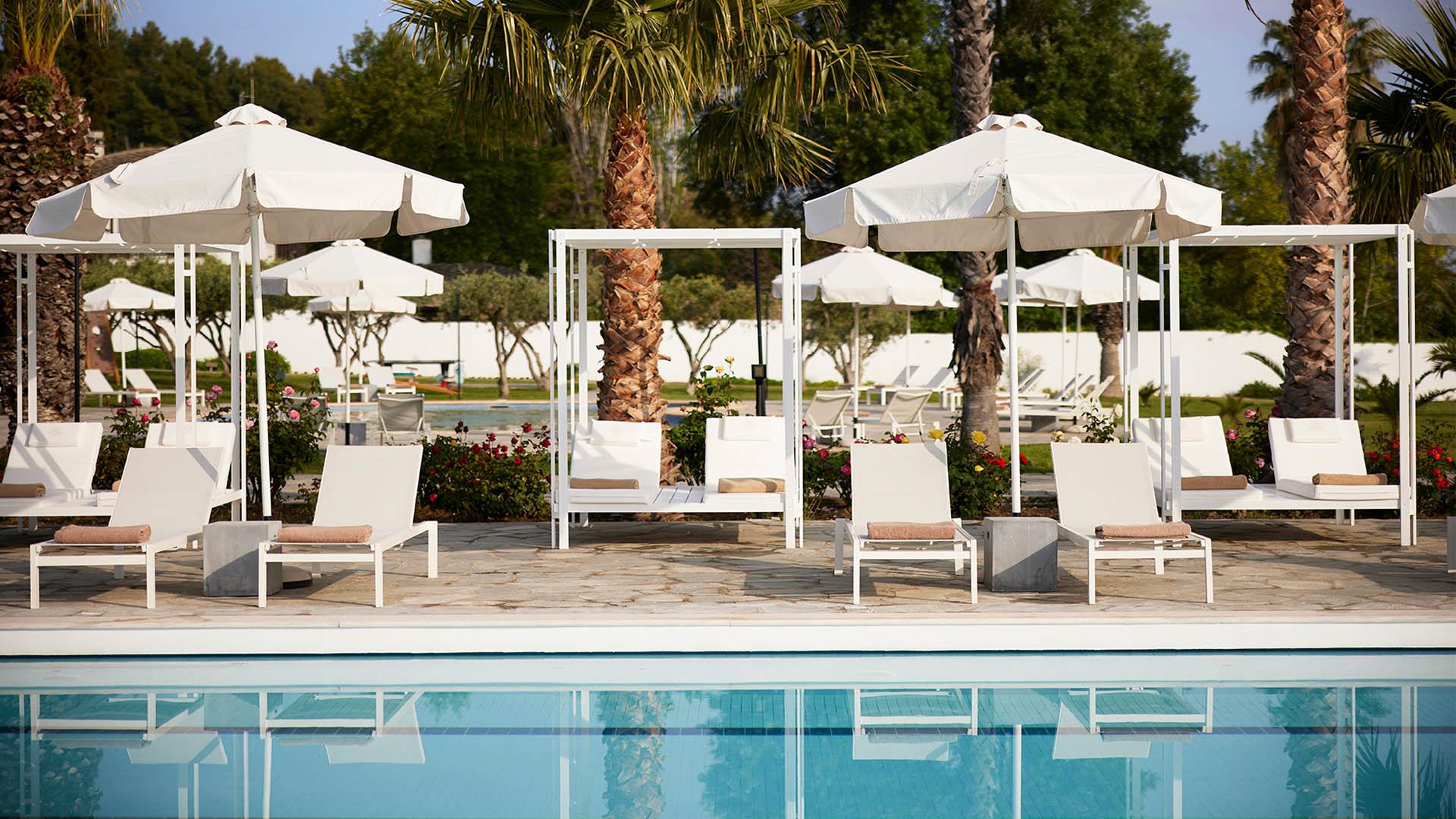 - SUITE ONE BEDROOM PRIVATE POOL – 50 кв.м (макс. 4): реновированный номер; спальня с двуспальной либо 2 односпальными кроватями, отдельная гостиная с 2 диванами-кроватями, ванная комната с душем, оборудованное патио с собственным бассейном и видом на море