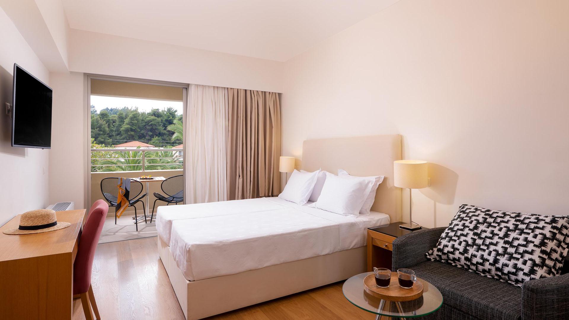 - DELUXE ROOM GARDEN VIEW – 27 кв.м (макс. 3): главный корпус; номер с двуспальной либо 2 односпальными кроватями, диван-кровать, ванная комната с ванной, оборудованный балкон с видом на сад