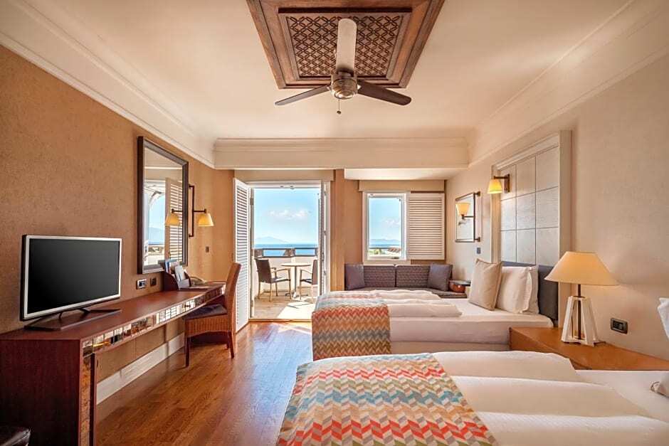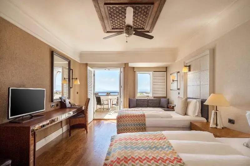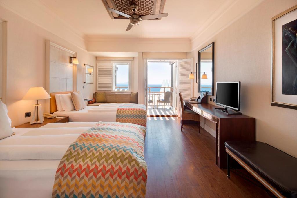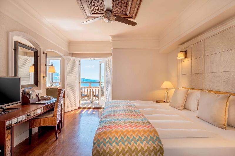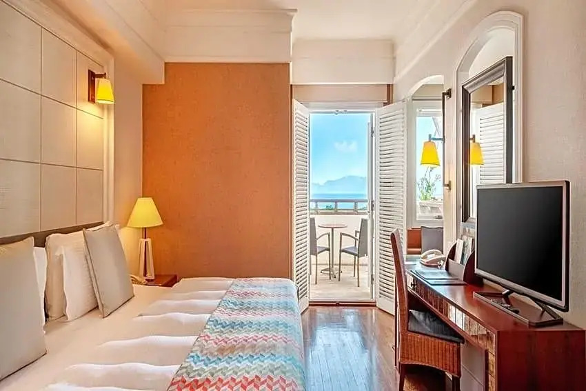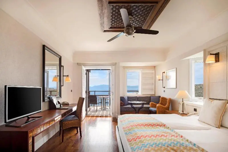 Описание номеров Kempinski Hotel Barbaros Bay Bodrum 5*:Отель Kempinski Barbaros Bay предлагает своим гостям 173 номера с балконами, откуда открывается вид на море. В каждом номере есть телевизор с возможностью просмотра кабельных каналов, кондиционер, потолочный вентилятор, сейф, телефон с прямым набором номера и мини-бар, помимо этого, предлагается бесплатный Wi-Fi. В ванных комнатах имеются телефоны и купальные халаты. Всех гостей ждут приятные приветственные подарки. По запросу предоставляются гипоаллергенные постельные принадлежности, детские кроватки, дополнительные полотенца и постельные принадлежности, а также услуга пробуждения по телефону. Обслуживание номеров осуществляется ежедневно.