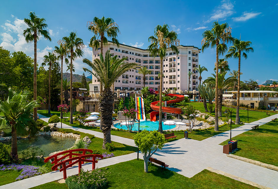 Отель находится на самом берегу моря, в поселке Чамьюва, в 8 км от Кемера. Представляет собой одно основное 7-ми этажное здание и 3-х этажный корпус Garden (рядом с теннисным кортом и бассейном, лифта нет).