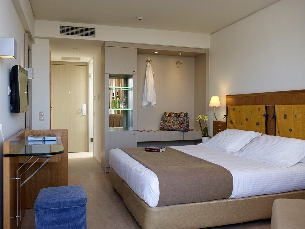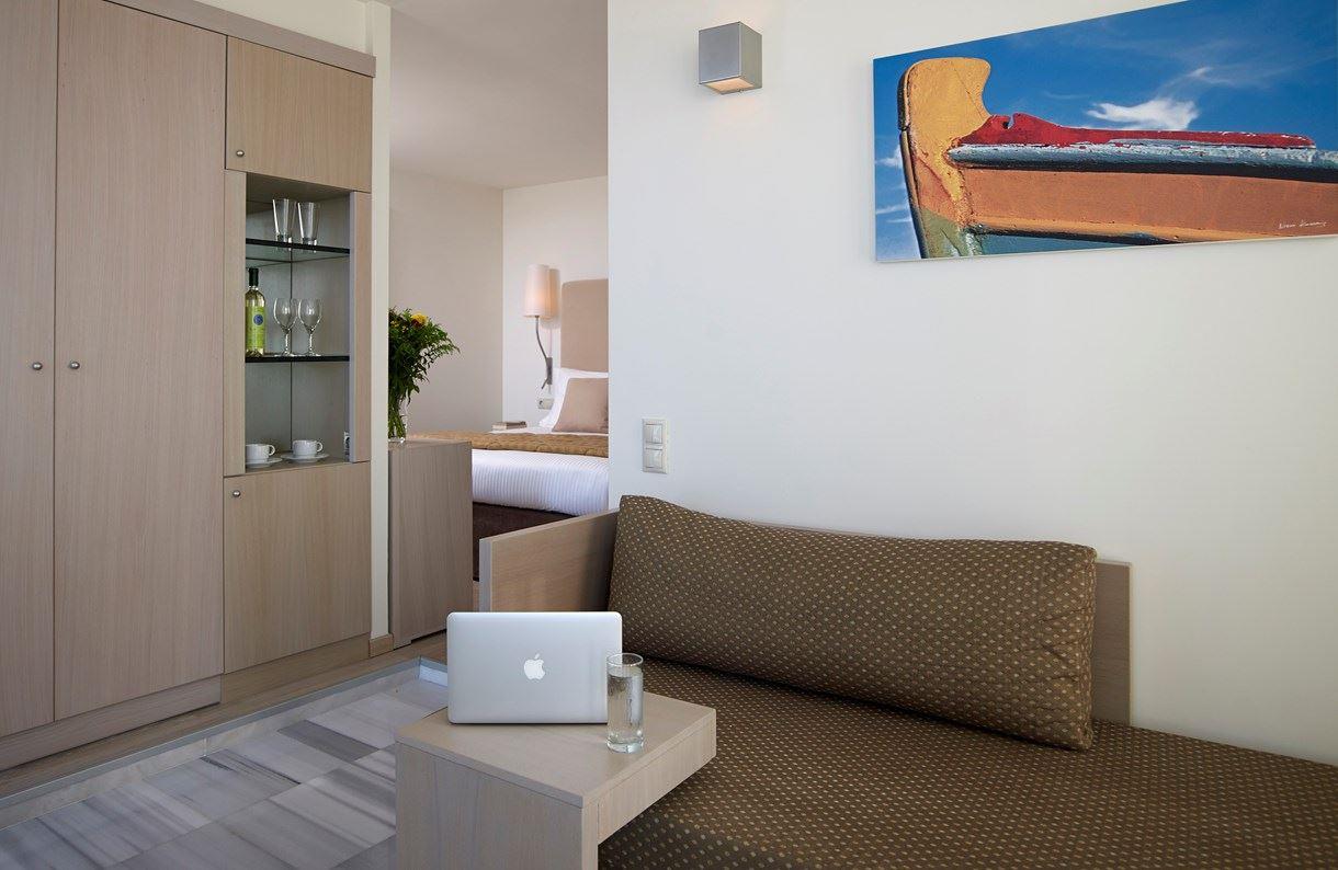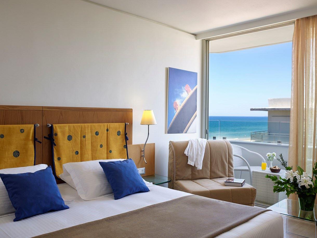 - 5 Deluxe Suite Front Sea View (32 кв.м., макс. разм. 3 чел.) - однокомнатный номер: состоит из зоны спальни и гостиного уголка без межкомнатной двери; ванная комната, балкон/терраса с видом на море