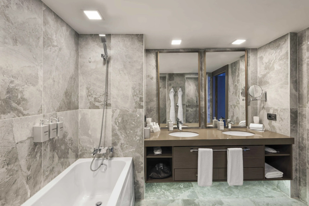 Номер уютно обставлен и оснащён необходимым, чтобы отдохнуть после долгого и насыщенного дня. Имеются телевизор, мини-бар и халат. Оснащение зависит от выбранной категории номера.