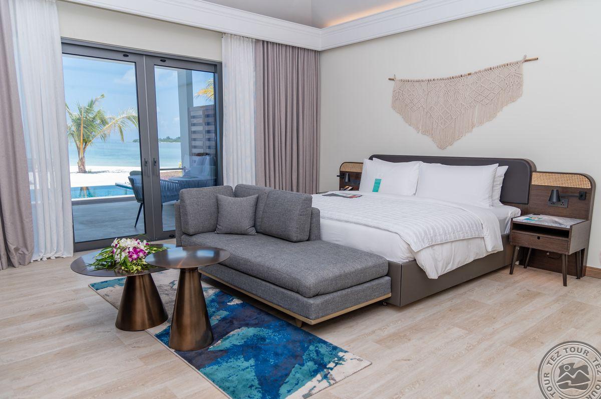 7 Lagoon Villa (100 м2; макс. 2+1 чел.). Виллы расположены частично на берегу, частично над водой. По наполнению идентичны номерам Sunrise/Sunset Overwater Villa;