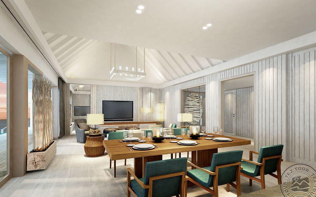 3 Temptation Pool Water Villa (220 м², макс. 2 чел.). Просторные водные виллы с видом на рассвет. Спальня с кроватью king-size, отдельная гостиная со стеклянной панелью в полу, ванная комната с джакузи и душем, душ на открытом воздухе. Терраса с частным бассейном (длина – 14 м), прямой спуск в воду.