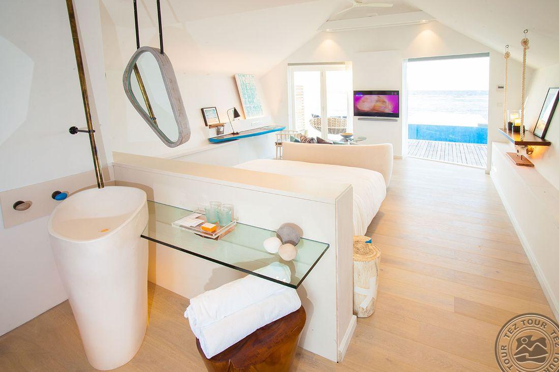 38 Water Villa (98 м², макс. 3 или 2+1 чел.). Водные виллы, расположенные на западной стороне острова. Ванная комната с видом на лагуну, большая терраса с прямым спуском в воду.