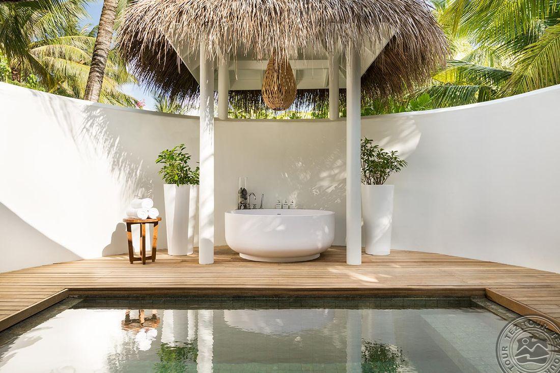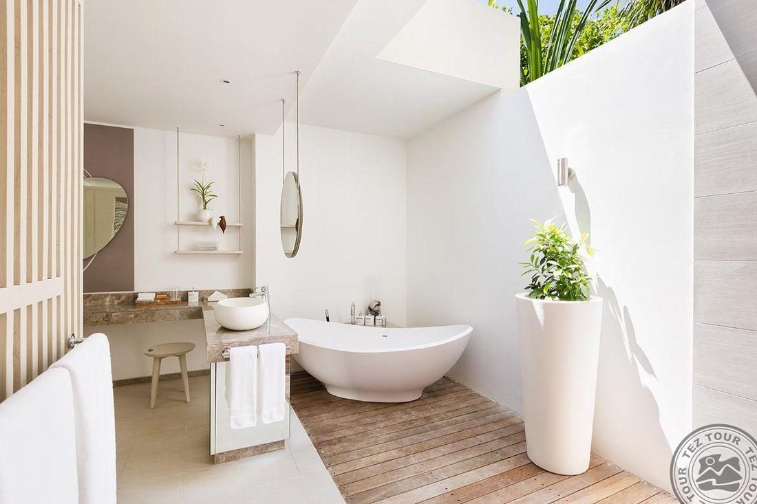 45 Beach Villa (95 м², макс. 3 или 2+2 подростка). Отдельно стоящие береговые виллы с прямым доступом к пляжу, расположенные по обе стороны острова. Спальня с кроватью king-size, ванная комната на открытом воздухе с ванной и душем, второй душ закрытый, терраса.
