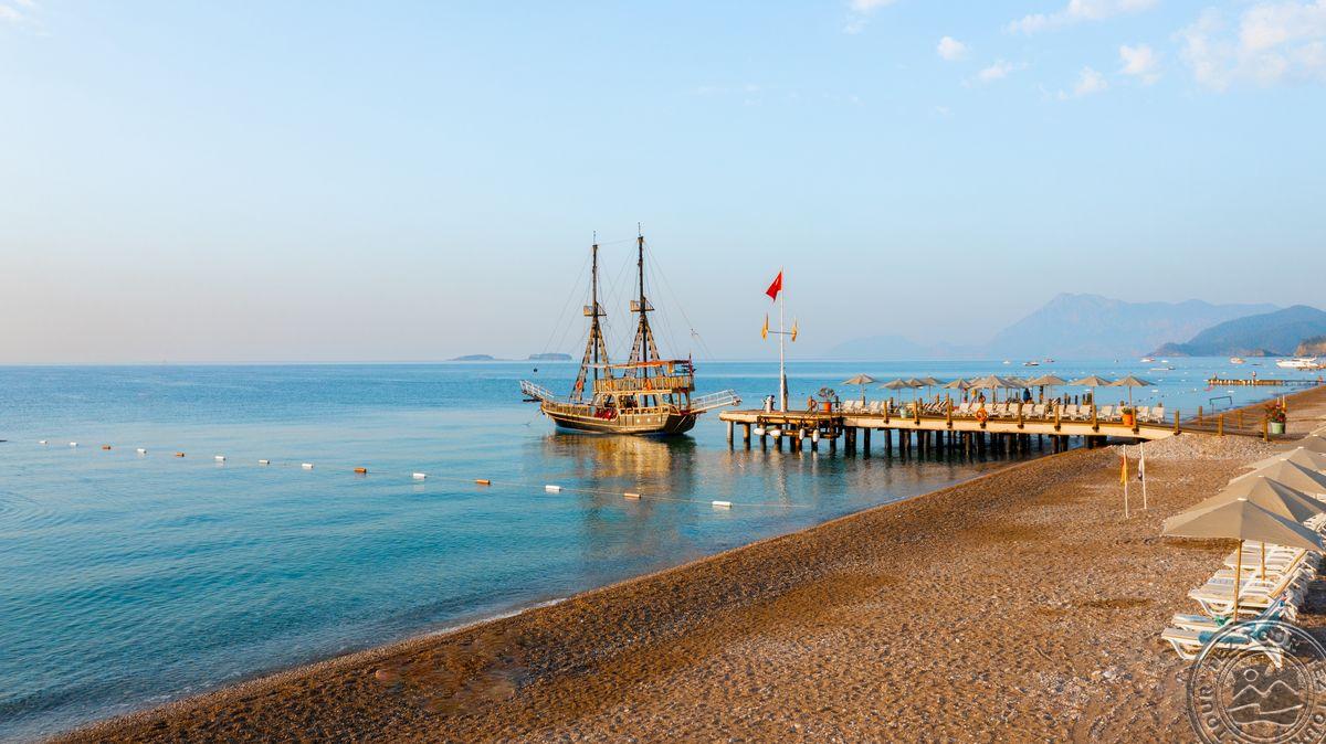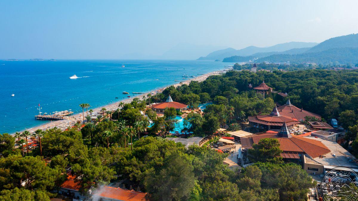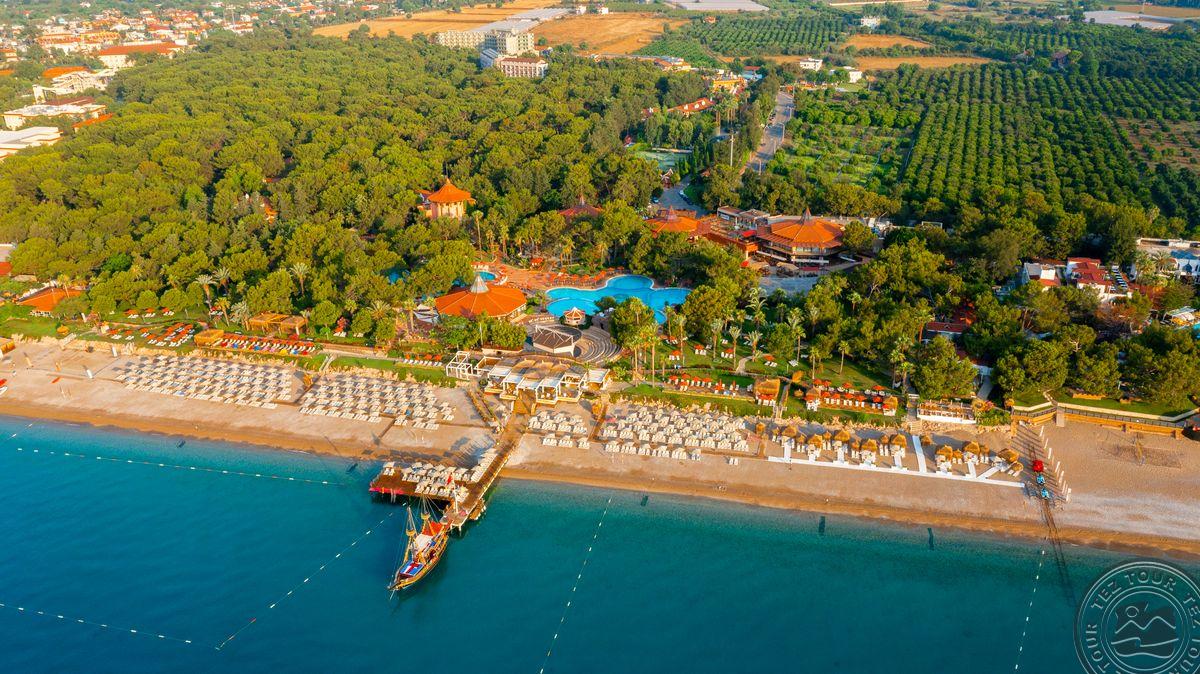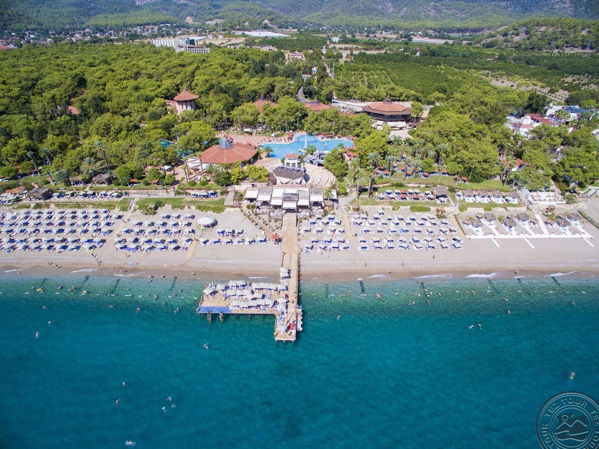 в 70 км от аэропорта г. Анталья, в 17 км от г. Кемер, в посёлке Текирова, на берегу моря.