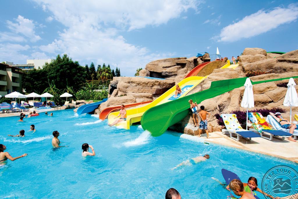 Территория:> рестораны: 1 (основной, диетическое (ужин), вегетарианское питание) бары: 4 крытые бассейны: 1 бассейны: 1 спа-центр конференц-залы: 2 (на 20–350 чел.) рестораны a la carte: 3 (турецкий, рыбный, международный, по предварительной записи, за неделю проживания посещение одного ресторана 1 раз – бесплатно) кабинет врача прачечная аквапарк (4 водные горки) Интернет-кафе платно у бассейна зонтики, шезлонги, матрасы: бесплатно парикмахерская магазины