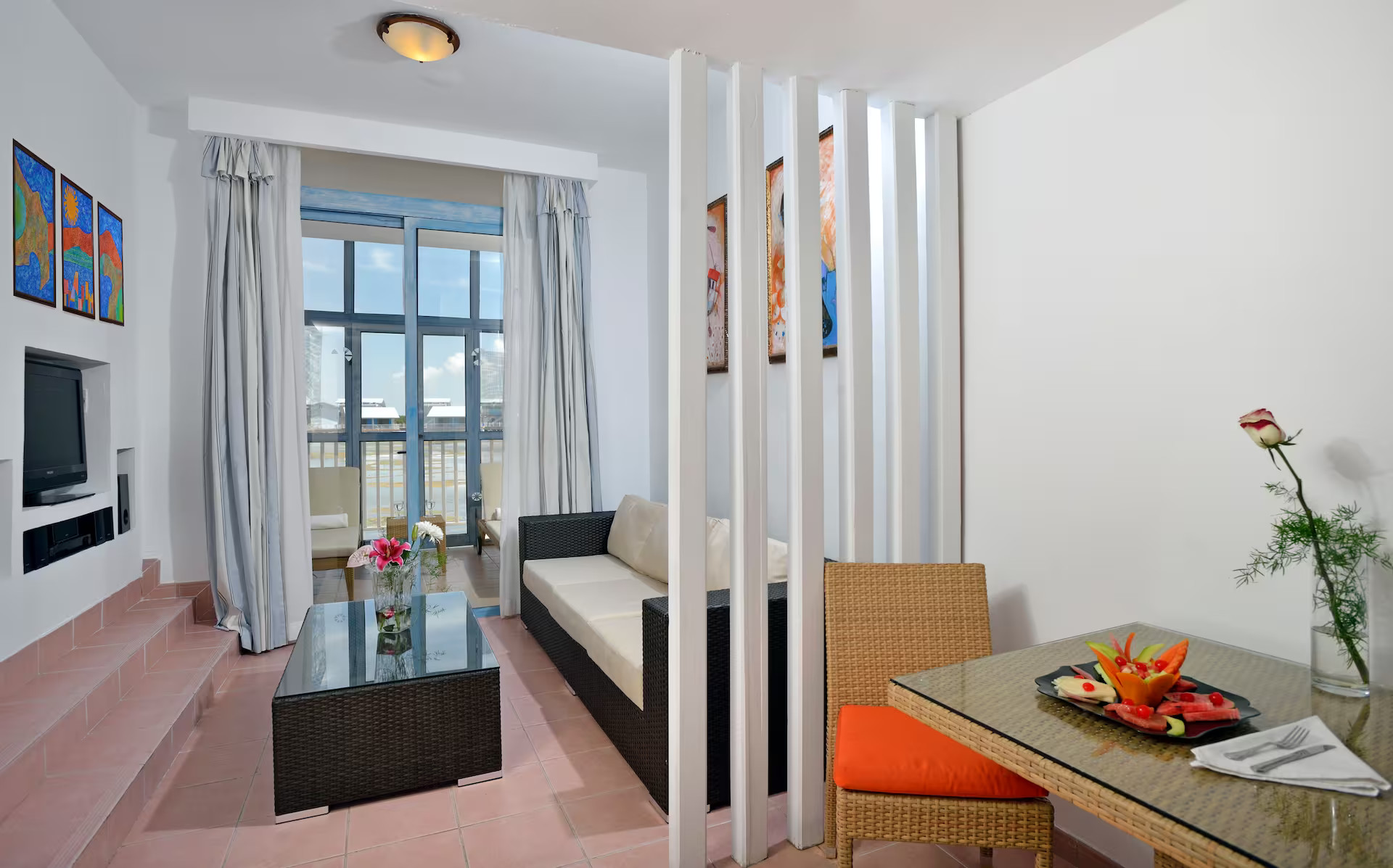 Junior Suite (в бунгало, 1 этаж, вид на сад, зона гостиной и спальня, двуспальная кровать, ванная комната с душем, пляжные полотенца, халат, ежедневный turn down service, индивидуальный check-in до 21.00, приветственный подарок, ужин с лобстерами при проживании мин 7 ночей (1 раз по запросу), эксклюзивный завтрак, 4 резервации ресторанов a la carte (при проживании мин 7 ночей), макс. 3 чел., 45 м2)