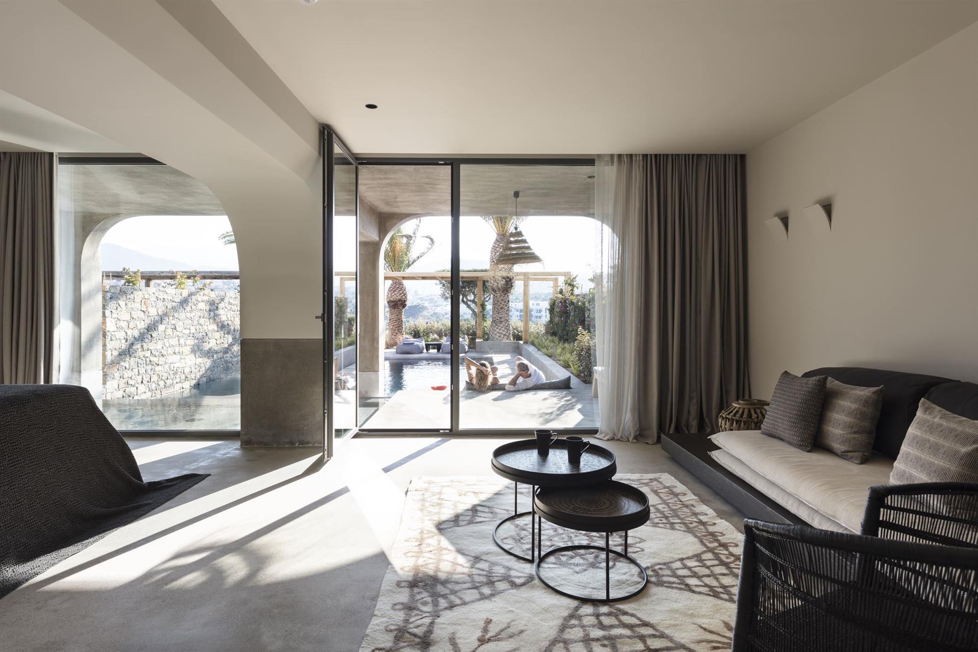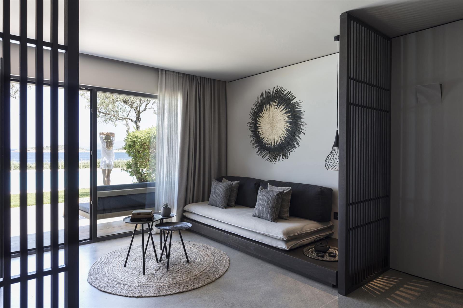 Junior Suite Sharing Pool sea view South side (38 кв.м) макс.разм. 4 чел, состоит из спальни и гостиной с раздвижной дверью , терраса с выходом к общему бассейну на 4 номера Suite.Ванная комната с джакузи.