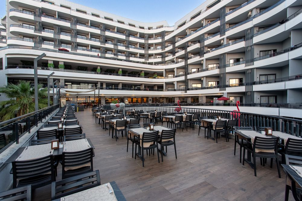 - Система питанияЗавтрак (с 07:00 до 10:00) - шведский стол, ГлавныйПоздний завтрак (с 10:00 до 10:30) - мини-шведский стол, ГлавныйОбед (с 12:30 до 14:00) - шведский стол, ГлавныйУжин (с 18:00 до 20:30) - шведский стол, ГлавныйНочная закуска (23:00 до 06:00) - шведский стол, SeasoЗакуски (с 12:00 до 16:00) - a la carte, FlowРесторанный дворик (с 12:00 до 16:00) - шведский стол, печеный картофель, холодные сэндвичи, вафли, SeasoМороженое (с 12:00 до 18:00) - стакан или рожокКондитерская (с 13:00 до 17:00) - шведский стол, в лоббиБесплатные напитки: В меню Ultra All Inclusive включены все местные алкогольные и безалкогольные напитки, и коктейли, которые подаются в стаканахПлатные напитки: напитки в бутылках, свежий апельсиновый сок, напитки премиум-класса, импортные напитки, шампанское, специальные вина, специальные коктейли, специальные коньяки.Внимание! Алкоголь не подается лицам младше 18 лет