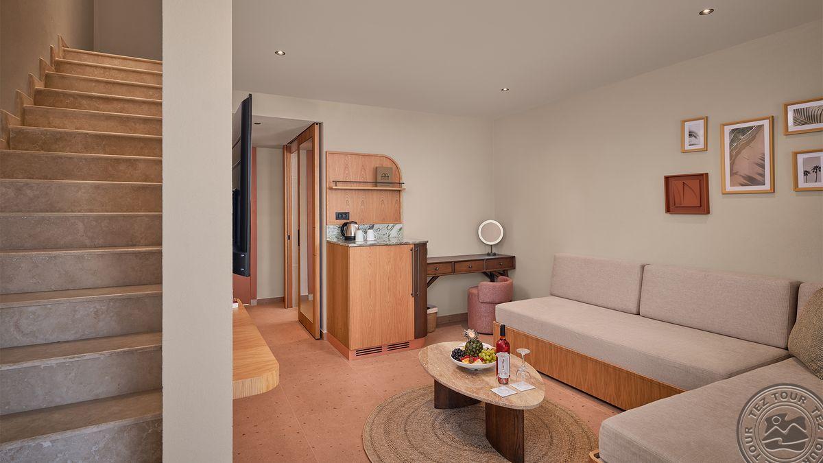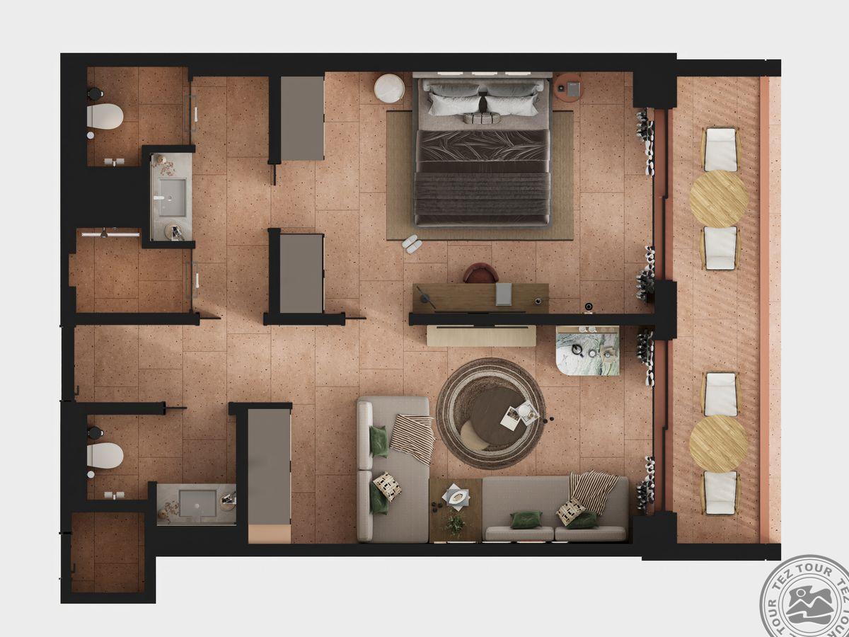 26 двухэтажных Duplex Family Suite (на первом уровне гостиная с ваннйо комнатой, на втором уровне спальня с ванной комнатой, макс. 4+1 чел., 55 м2);
