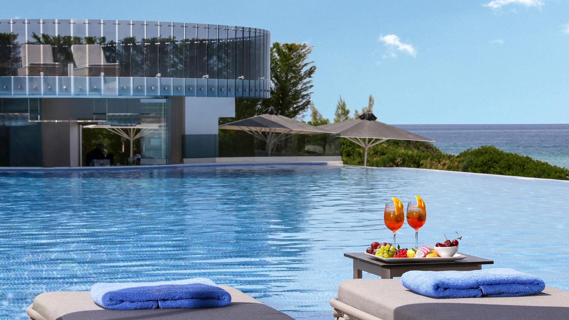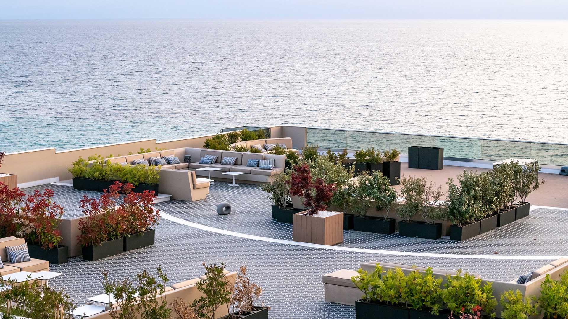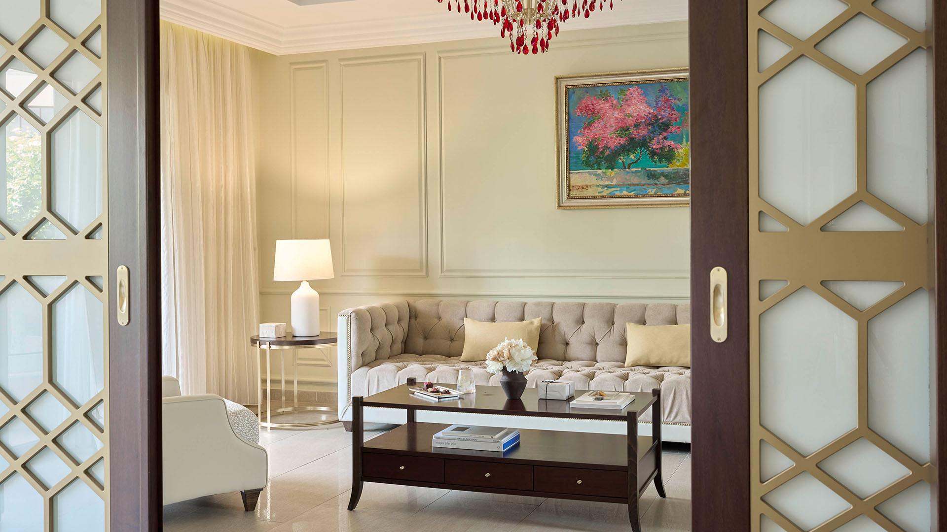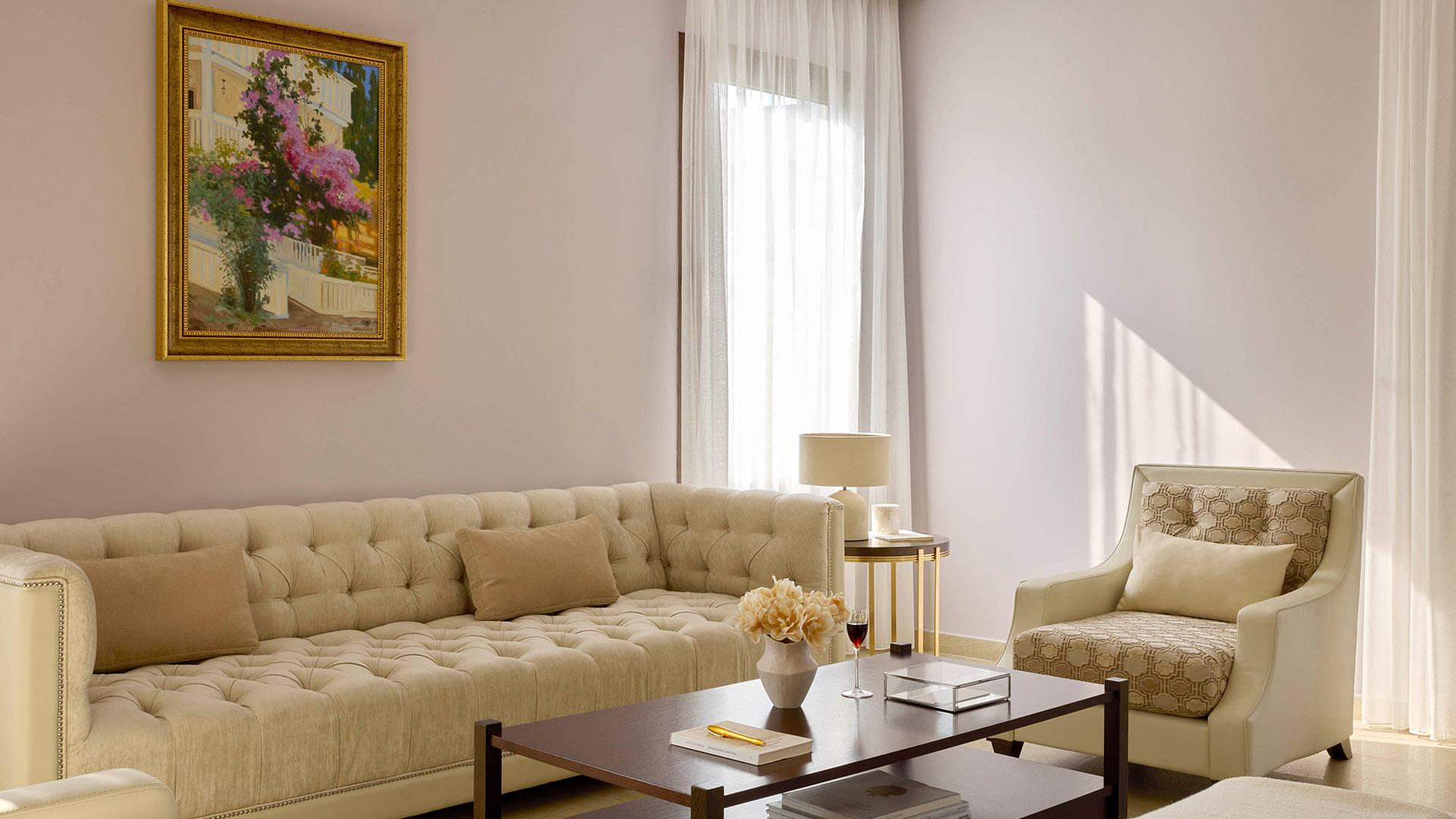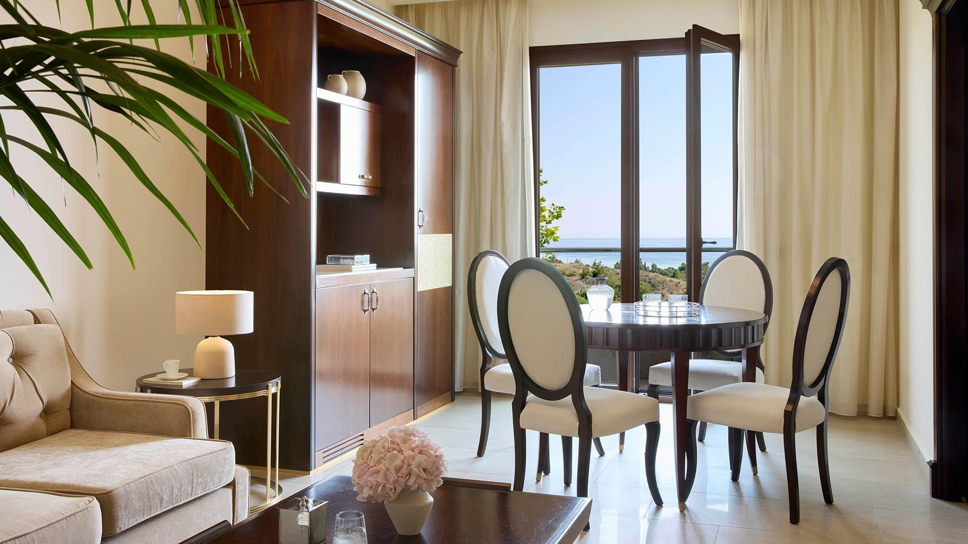 Pomegranate Suite:– 106 кв.м (макс. 3): Коллекция Prestige Suites: номер открытой планировки с кроватью king-size, гостевая зона с диваном-кроватью и креслами, обеденная зона, ванная комната с джакузи и отдельной душевой кабинкой, оборудованный балкон с панорамным видом на море