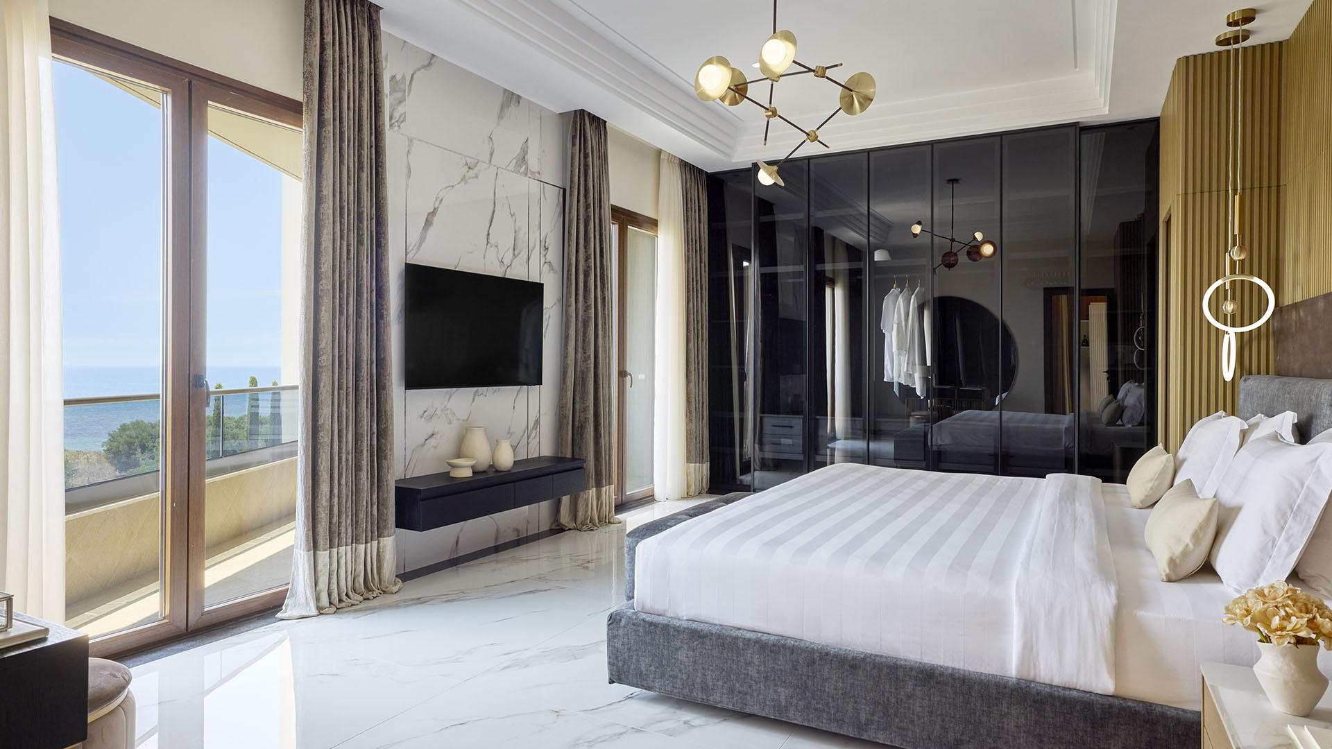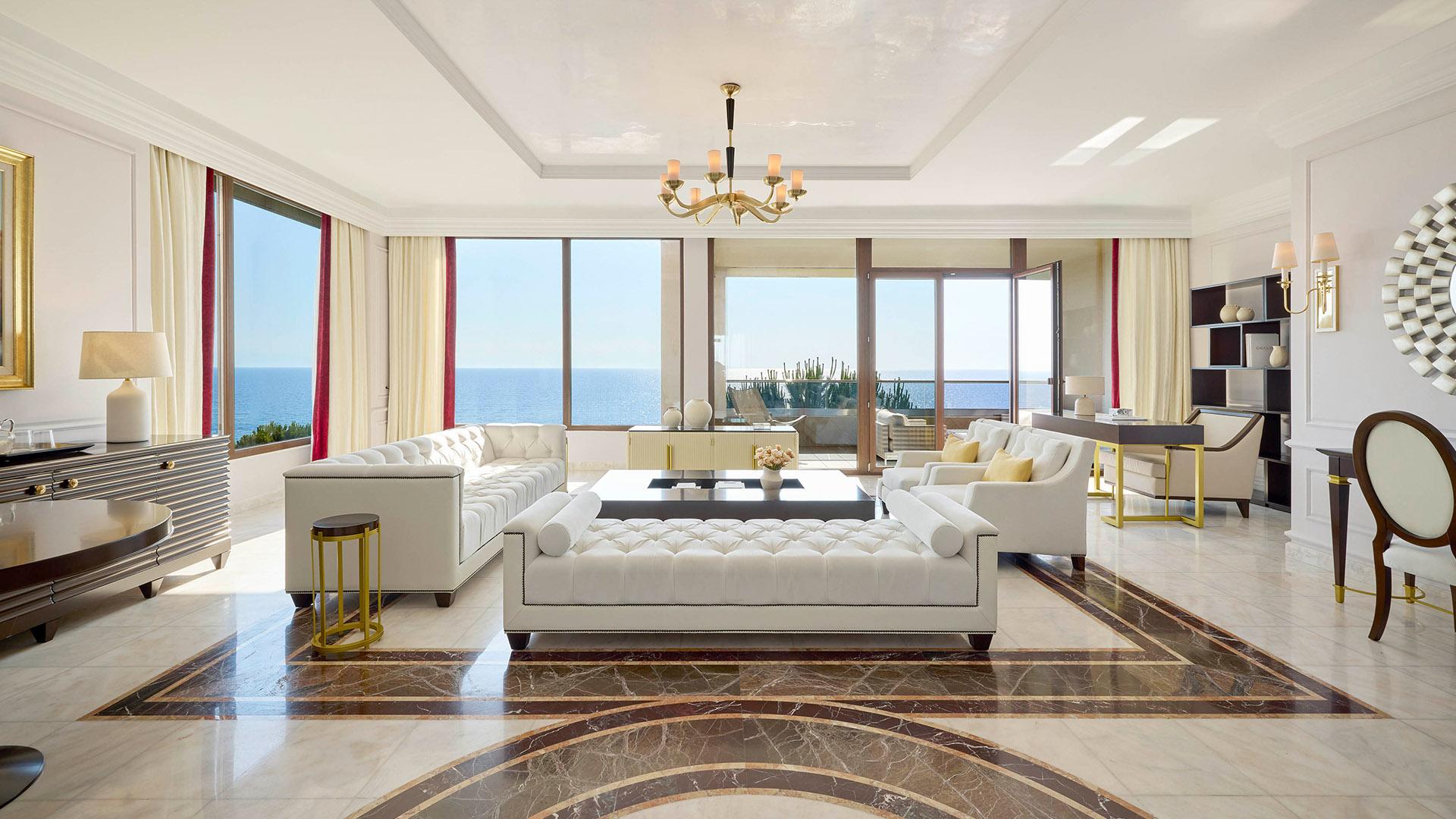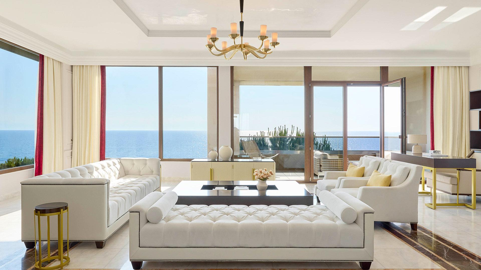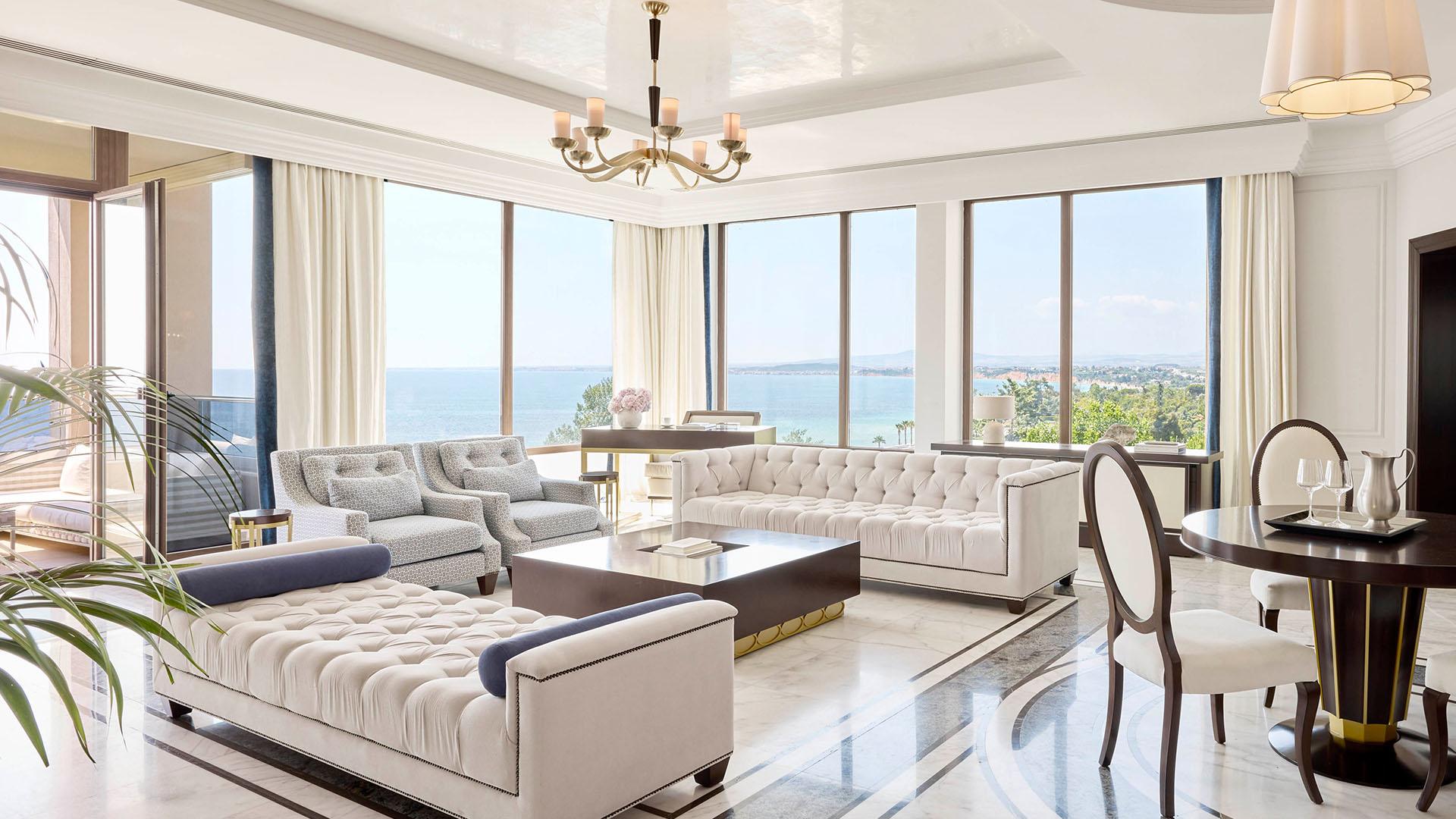 Presidential Suite:– 160 кв.м (макс. 4): Коллекция Prestige Suites: 2 раздельные спальни с кроватями king-size, отдельная гостиная, зона отдыха с обеденным столом на 4 персоны, 2 ванные комнаты ванной или душевой, просторные балконы с панорамным видом на море