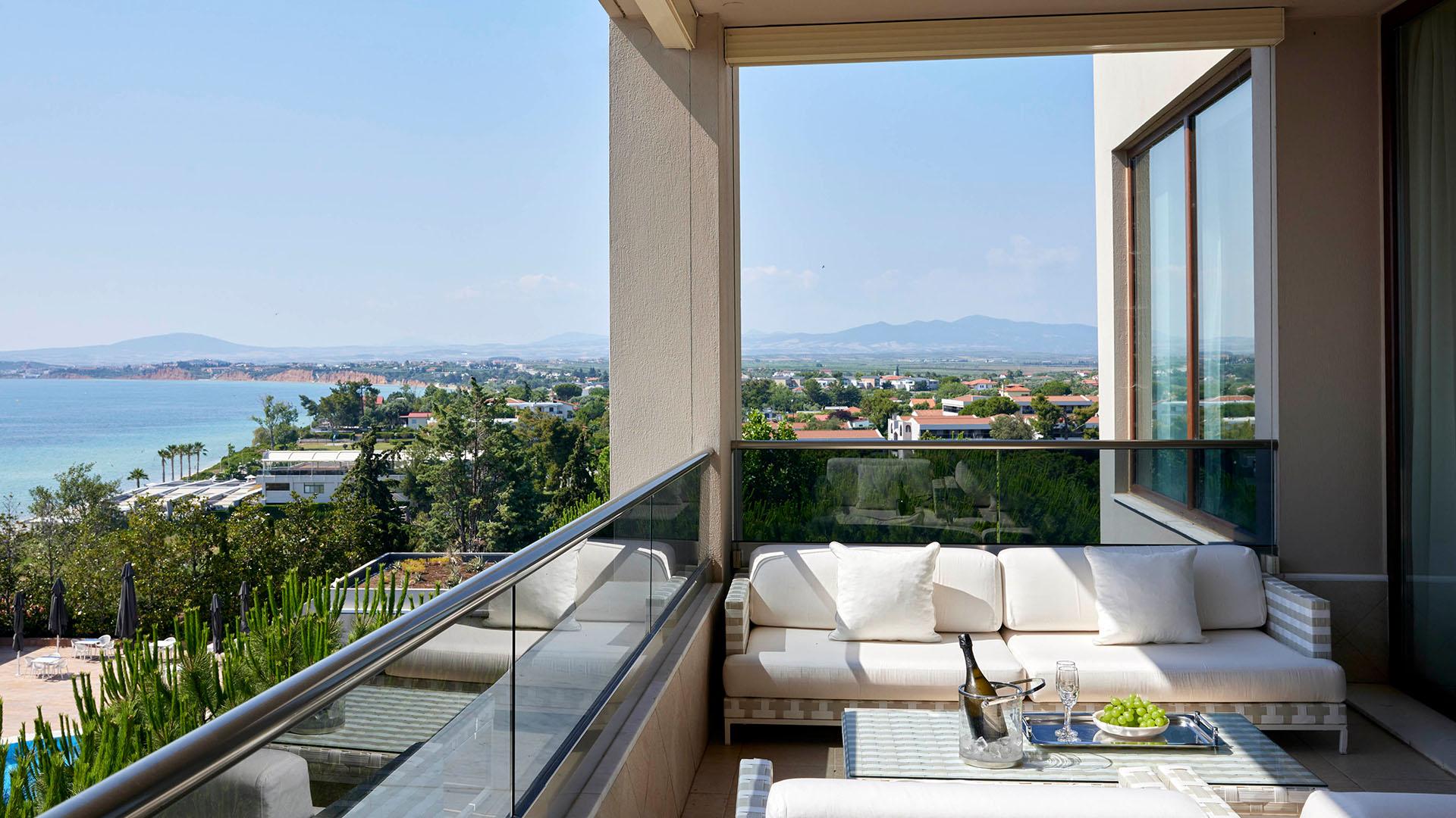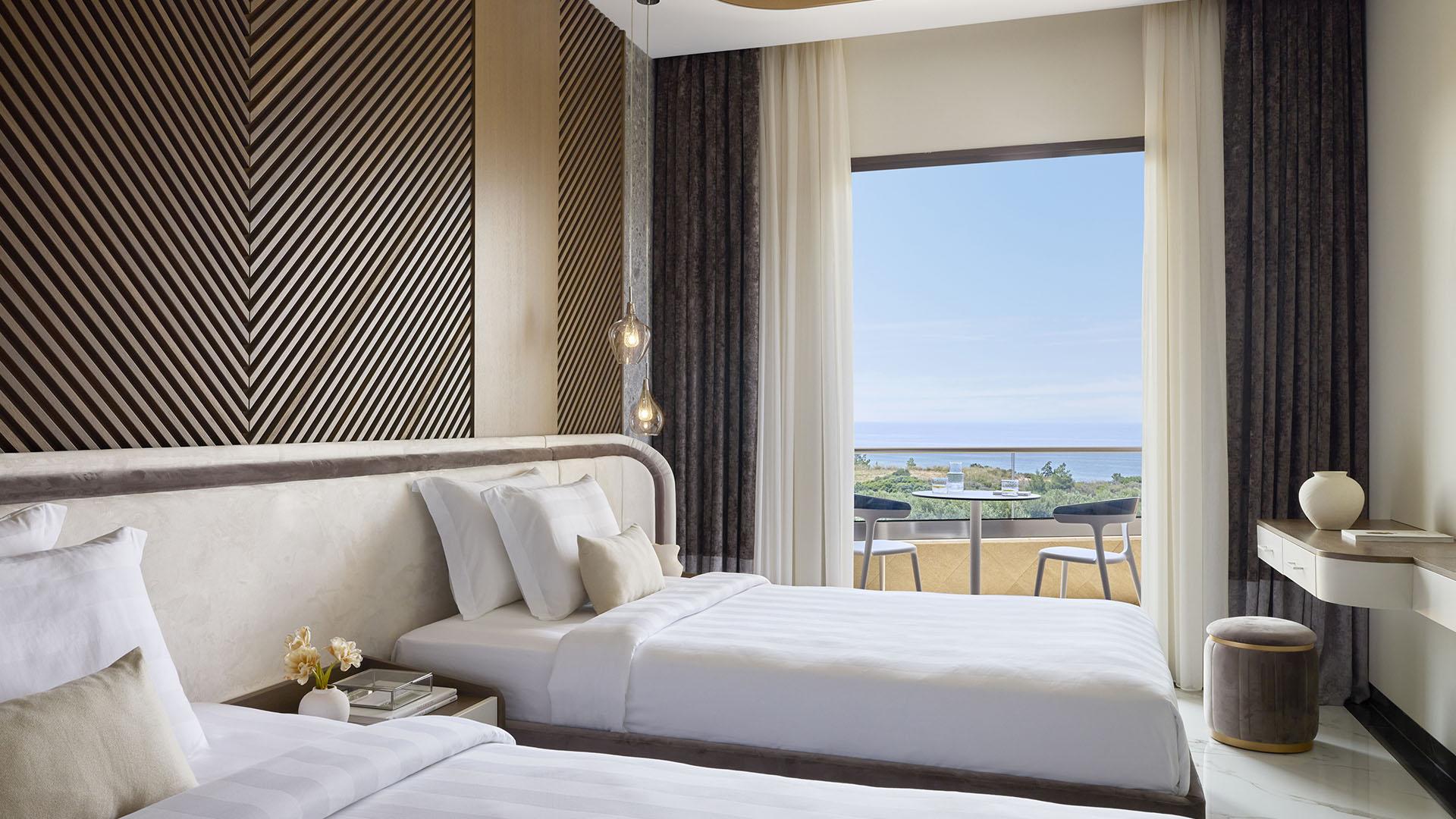 Elegant Room Side Sea View:– 30 кв.м (макс. 3): Коллекция Elegant Rooms: обновлен в 2024 г; номер с кроватью king-size либо 2 односпальными кроватями, комфортабельный диван, ванная с гидромассажем, оборудованный балкон с частичным видом на море