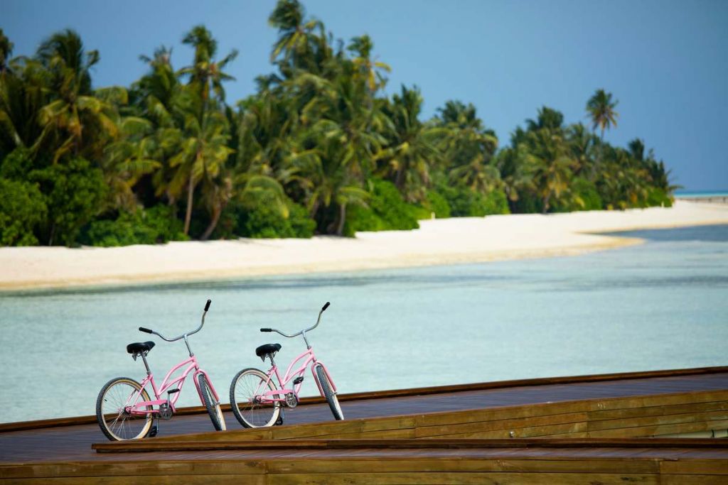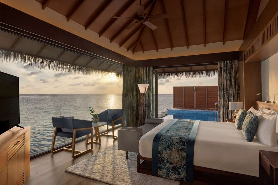 - (14) Sunset Ocean Pool Villa (Общая площадь 165 кв.м. Площадь виллы 91 кв.м) По наполнению идентичны Ocean Villa Pool, но имеют вид на закат. На вилле: спальня с зоной отдыха и кроватью king (в полу есть небольшая стеклянная панель для наблюдения за океаном), ванная комната с ванной и душем, с просторной террасы с зонами отдыха и бассейном можно спуститься в лагуну и любоваться завораживающими Мальдивскими закатами.
