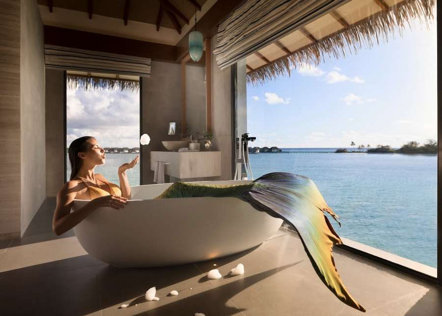 - (02) Aqua Villa (Общая площадь 209 кв.м. Площадь виллы 113 кв.м) Откройте магию океана на эксклюзивной двухуровневой вилле в лагуне с подводной спальней. На верхнем уровне расположена гостиная, спальня с кроватью king, ванная комната с ванной и душем, терраса с зонами отдыха и бассейном 10,5 м. На нижнем уровне под водой расположилась спальня с кроватью king и завораживающим видом на морскую жизнь.