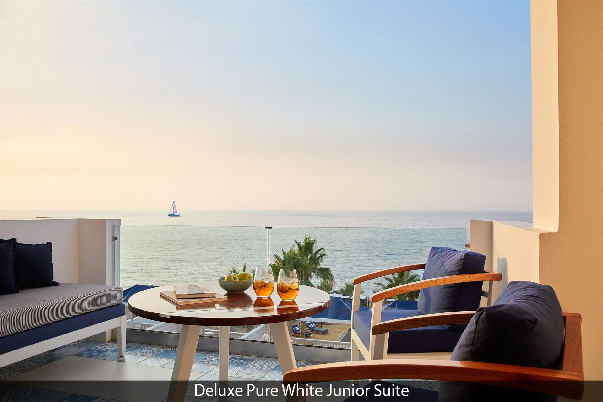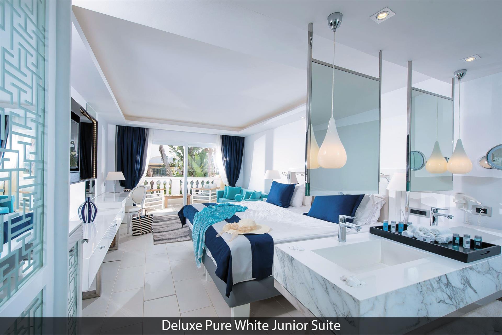 • Deluxe Pure White Junior Suite (полная реновация в 2019 г., в двух шагах от пляжа, вид на море, однокомнатный номер открытого плана, осн.кровать – двуспальная или 2 односпальные, доп. - диван-кровать, макс. 2+1 чел., 34 м2, балкон),