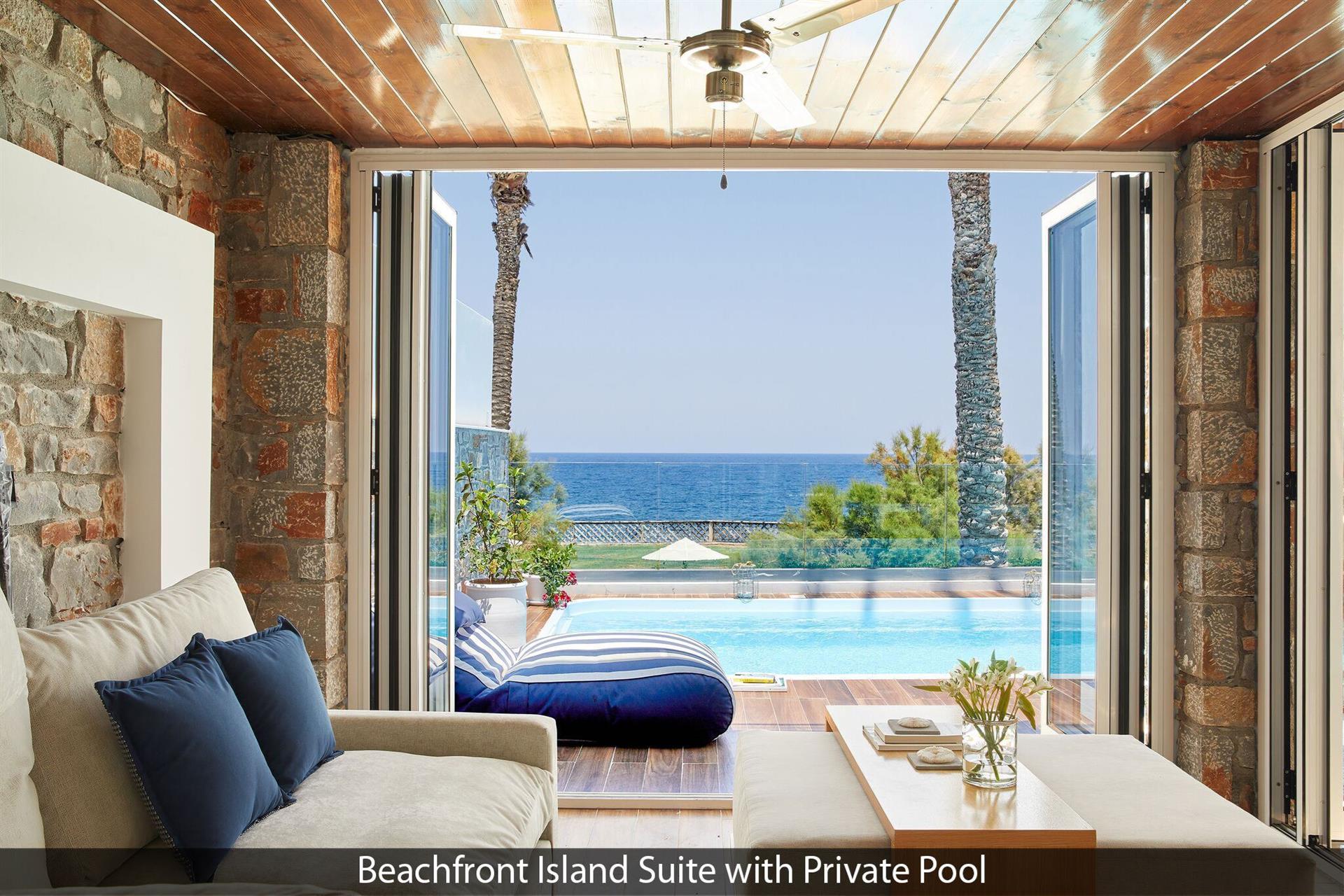 • Beachfront Island Suite with Private Pool (находятся на первой линии пляжа, реновация в 2019 г., 52 м2, спальня с двуспальной кроватью, доп. - диван-кровати, гостиная, макс. 2+2 чел., собственный бассейн, частная открытая зона 25-35 кв.м).
