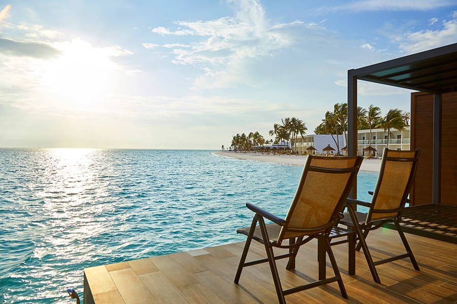 Over Water Suite (47 кв.м.) номера расположены в лагуне на сваях над водой. Описание номеров Riu Palace Maldives 5*: спальня, ванная комната с душем, терраса со спуском в океан.