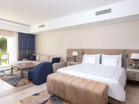 Junior Suite Blue Planet (58-65 м2): одна спальня с двуспальной кроватью, гостиная, ванные комнаты 2. Вид на сад либо боковой вид на бассейн; максимальное размещение 3 взр. либо 2 взр. и 2 детей