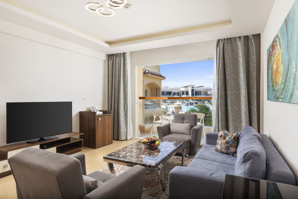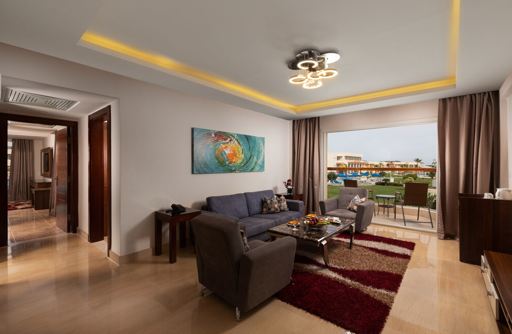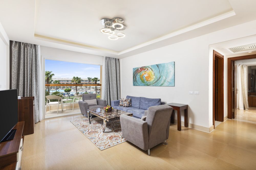 JUNIOR SUITEВид из номера: на сад/бассейнПлощадь номера: 65 кв.мКомментарий: спальня и гостиная (без межкомнатной двери)
