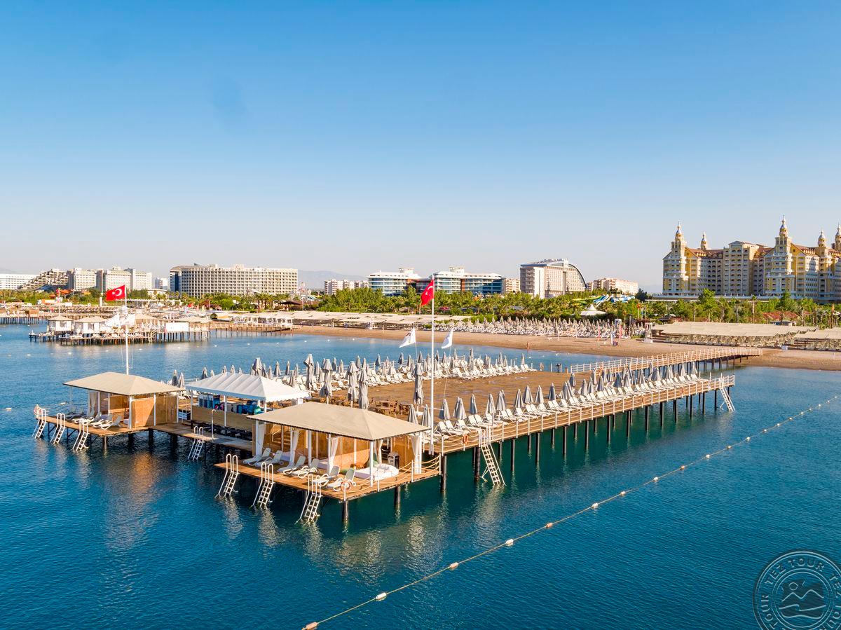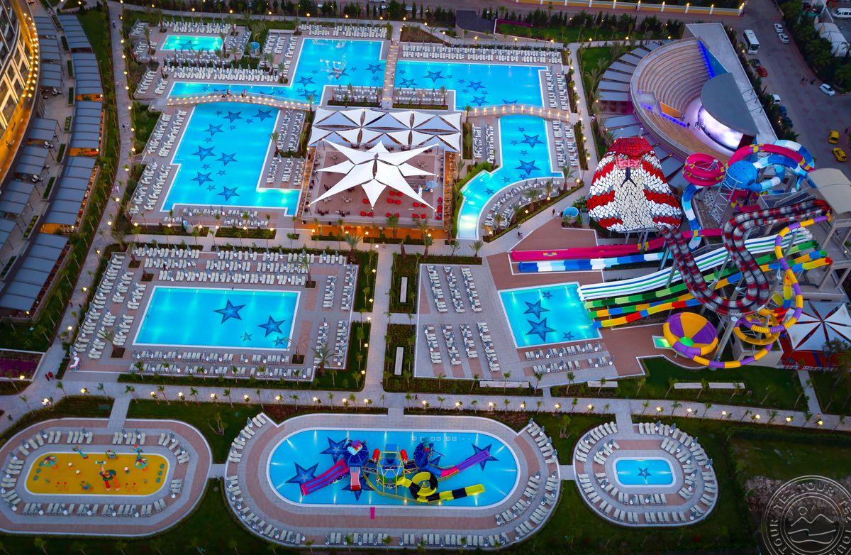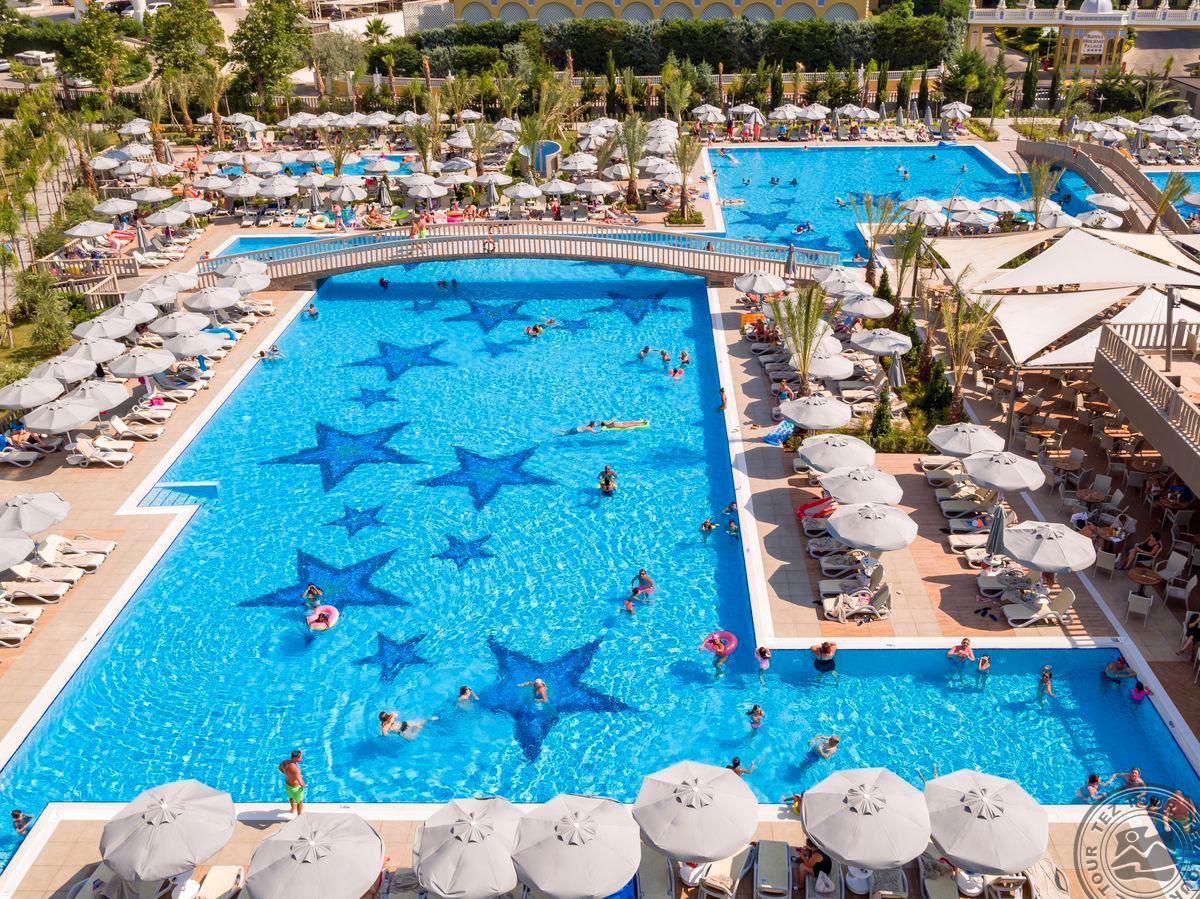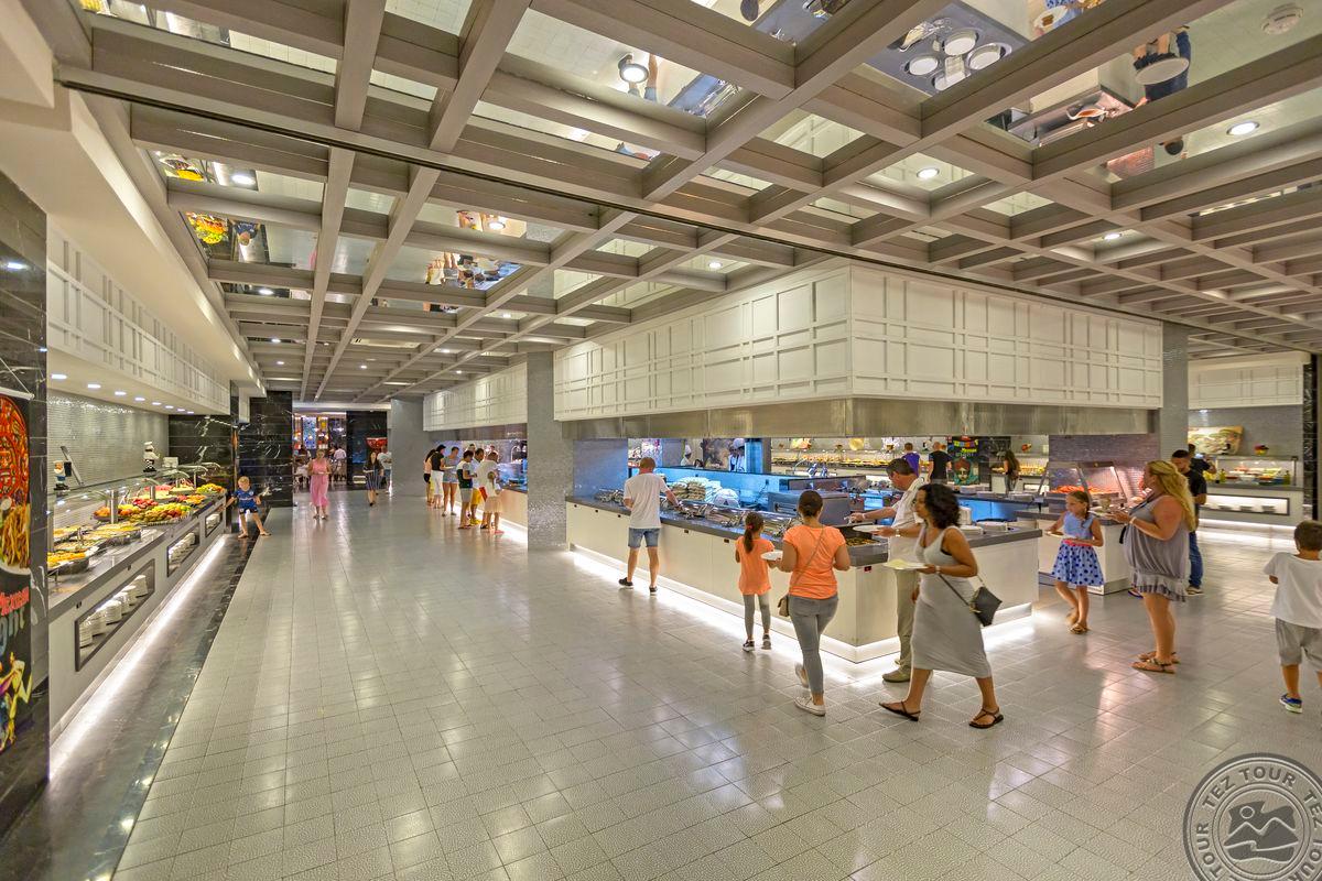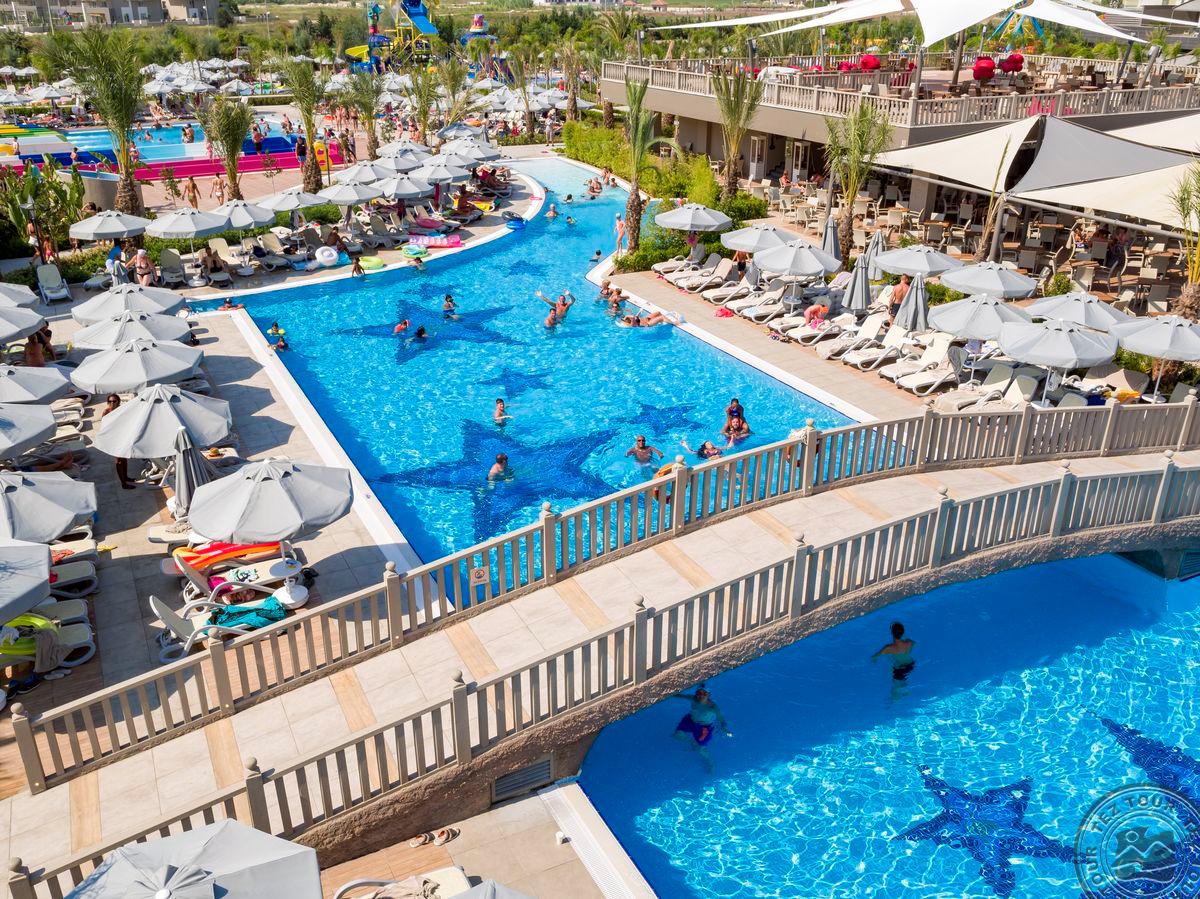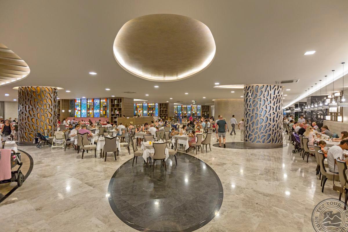 Территория:> рестораны: 1 (основной, есть диетическое питание) бары: 11 крытые бассейны: 1 (работает только в зимний период, с подогревом) бассейны: 4 (открытые (один из них с подогревом)) спа-центр конференц-залы: 18 (на 90–3000 чел.) у бассейна полотенца: бесплатно (замена в тот же день – платно) у бассейна зонтики, шезлонги: бесплатно (шезлонги мягкие) химчистка рестораны a la carte: 9 (морепродукты, турецкий, итальянский, дальневосточный, стейк, мексиканский, суши, испанский, теппаняки– по предварительной записи, платно, работают в определенные дни недели) кабинет врача водные горки: 8 (для взрослых, в том числе King kobra, 15.04.-31.10, в определенные часы, в зависимости от погодных условий) прачечная Wi-Fi бесплатно (на всей территории; высокоскоростной – платно) парикмахерская магазины