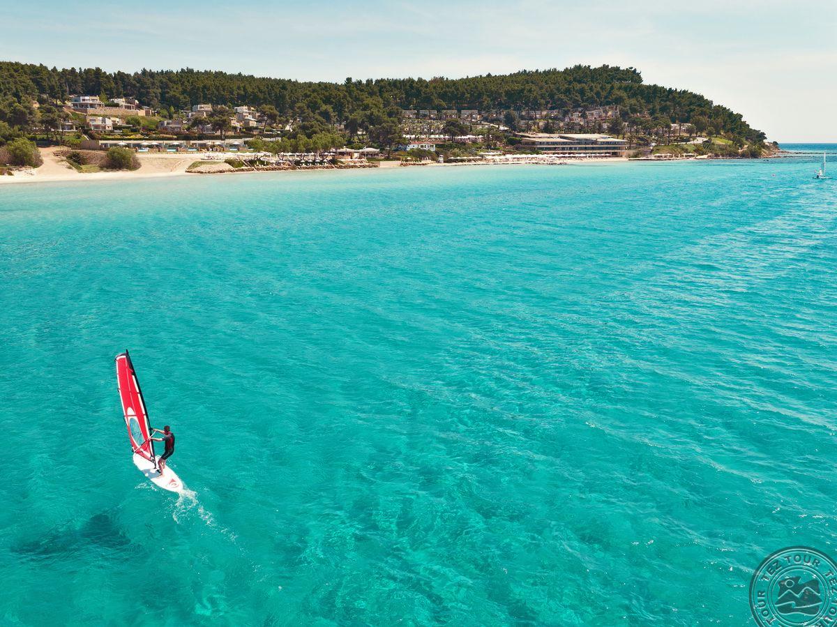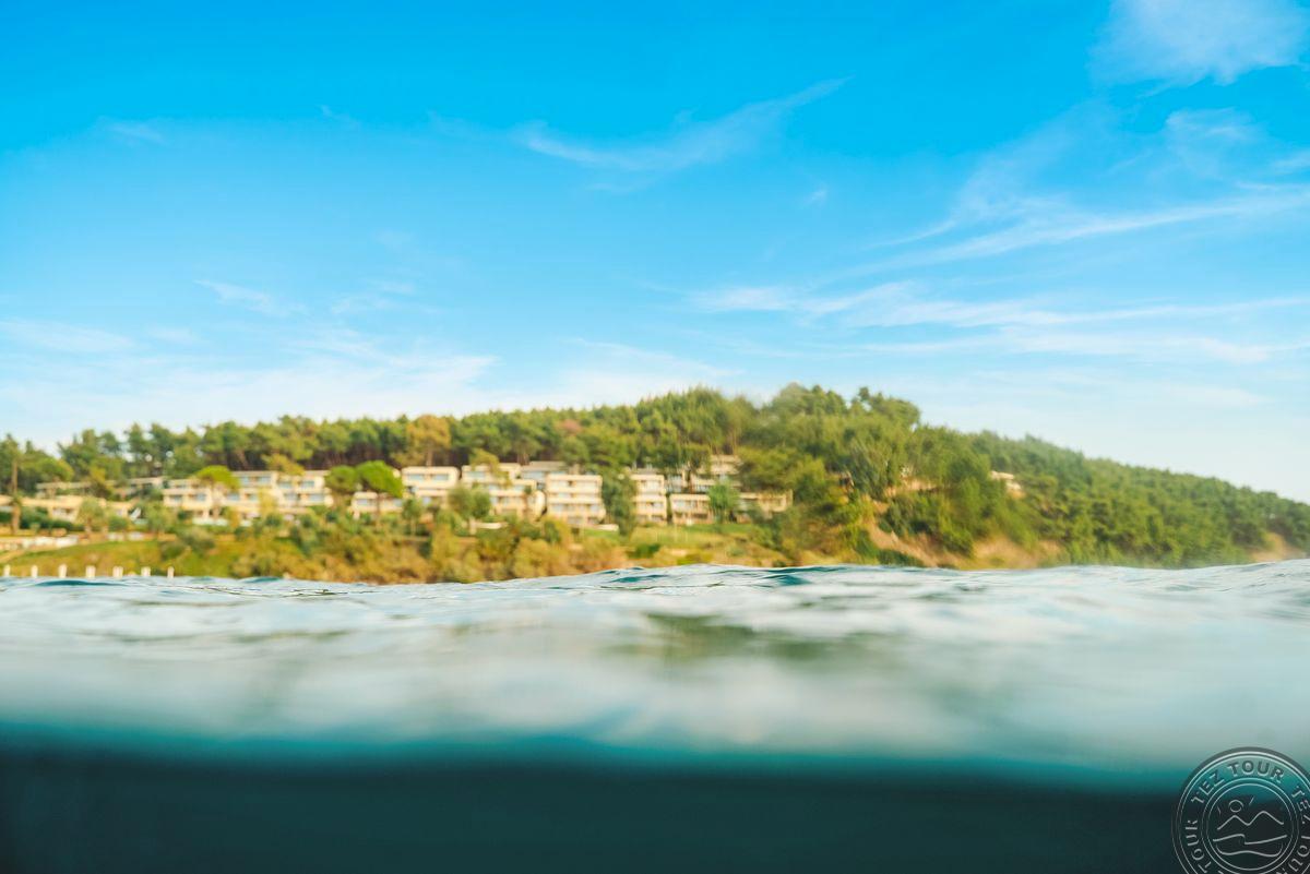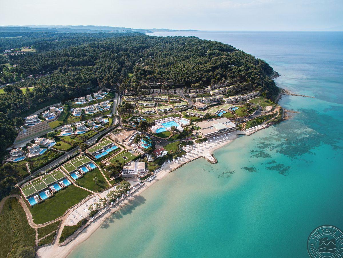 на западном побережье полуострова Кассандра, в регионе Сани, в 80 км от аэропорта г. Салоники, на берегу моря.