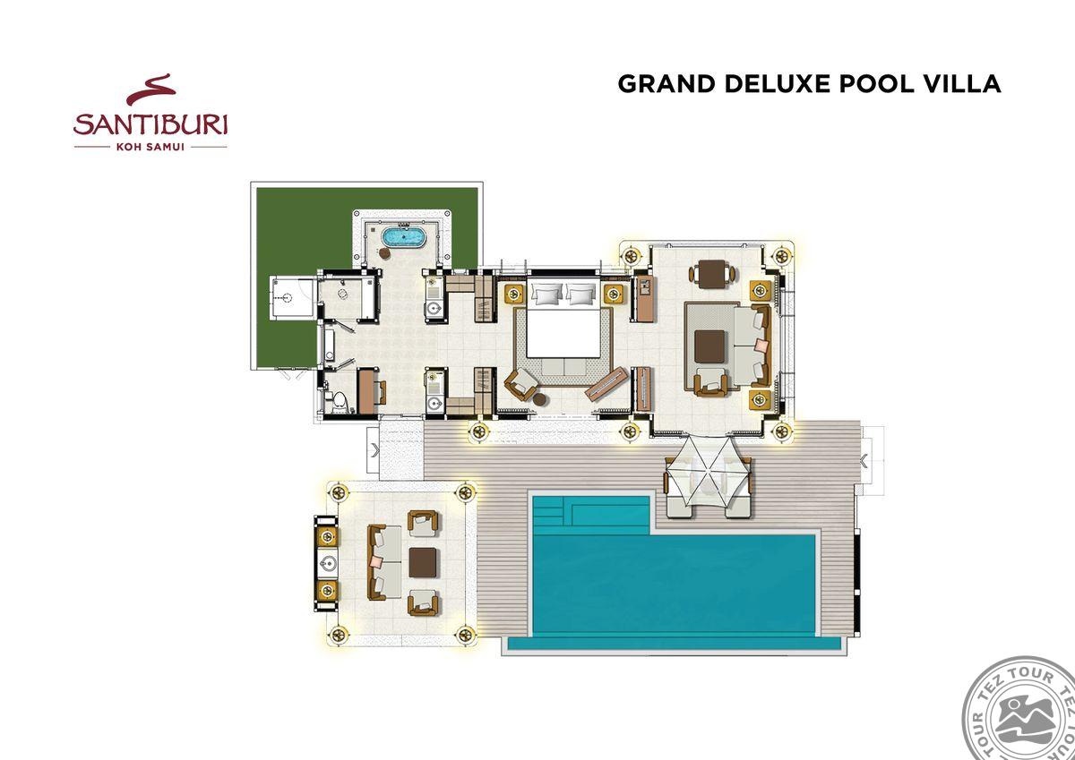 6 Grand Deluxe Pool Villa (расположены в саду, гостиная, спальня с дверью, двуспальная кровать, бассейн (9х4 м), зона отдыха с шезлонгами у бассейна, макс. 4 чел., общ. пл. участка виллы 285 м2);