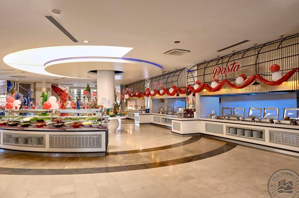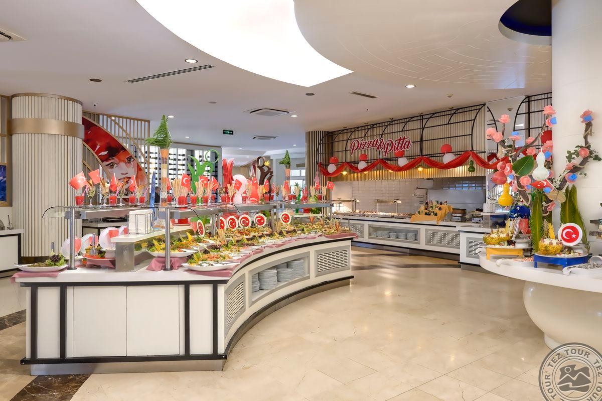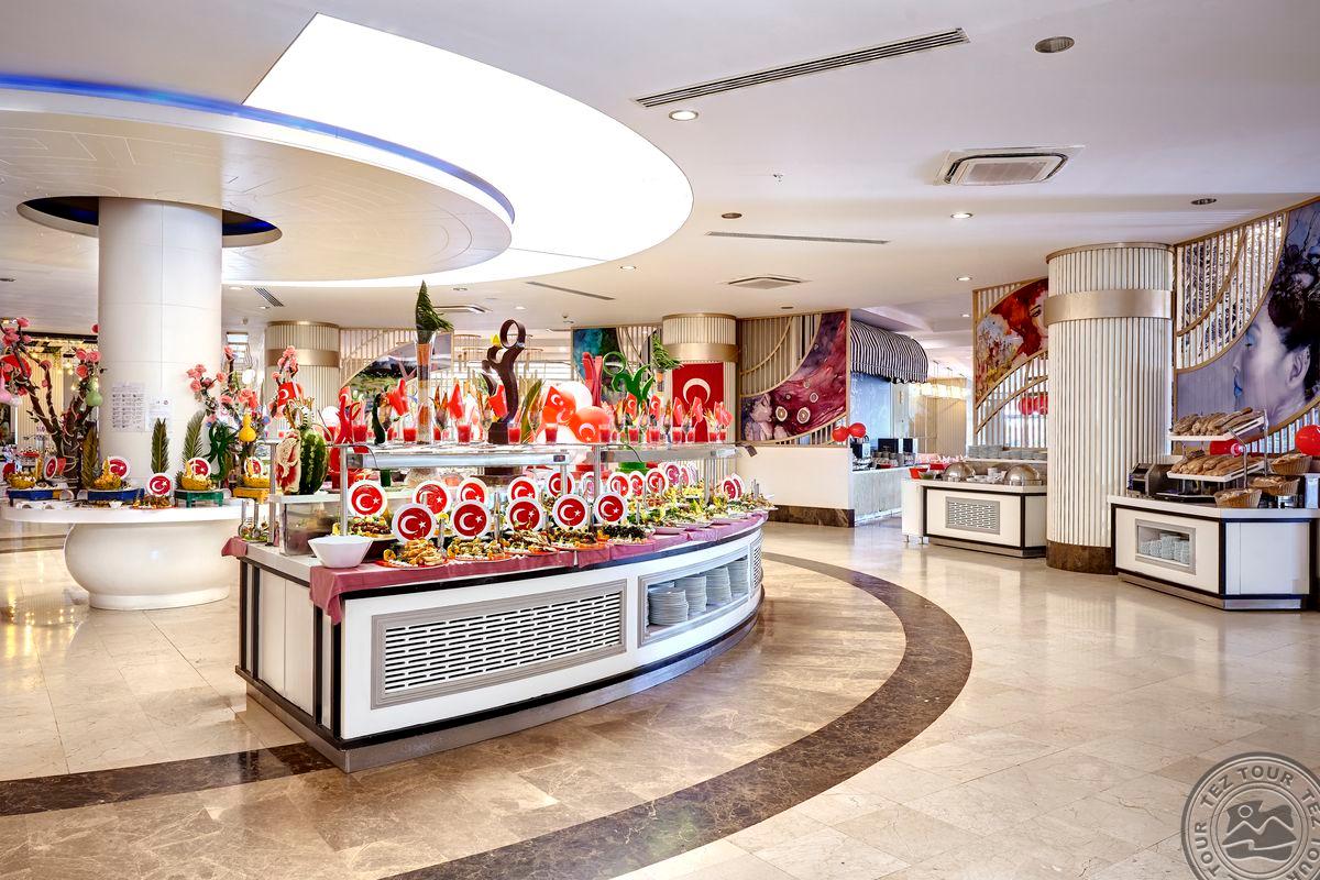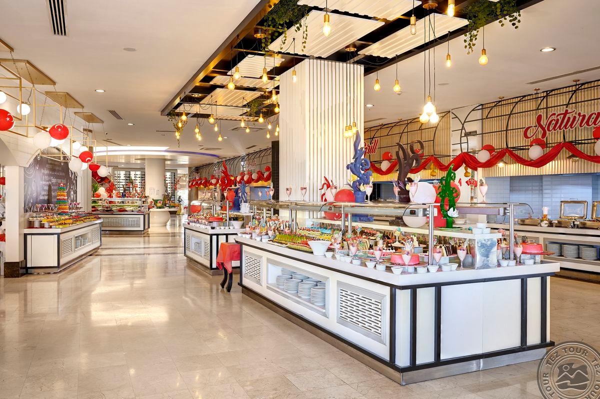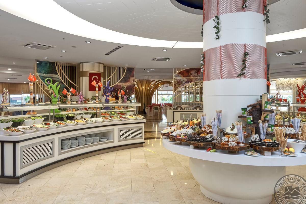 Территория:> рестораны: 1 (основной, есть вегетарианское питание) бары: 7 (один из баров работает 24 часа ) крытые бассейны: 1 бассейны: 3 (открытые) спа-центр (платно) конференц-залы: 4 (на 50–700 чел) у бассейна полотенца: бесплатно рестораны a la carte: 3 (османский, дальневосточный, итальянский - по предваительной записи, за неделю проживания посещение одного ресторана 1 раз – бесплатно) кабинет врача (в определенные часы, платно) кондитерская Wi-Fi бесплатно (на территории) Интернет-кафе платно прачечная платно у бассейна зонтики, шезлонги, матрасы: бесплатно парикмахерская (платно) магазины