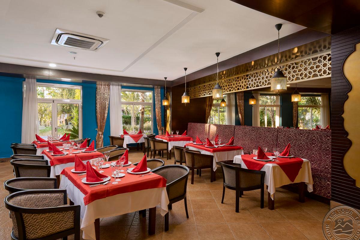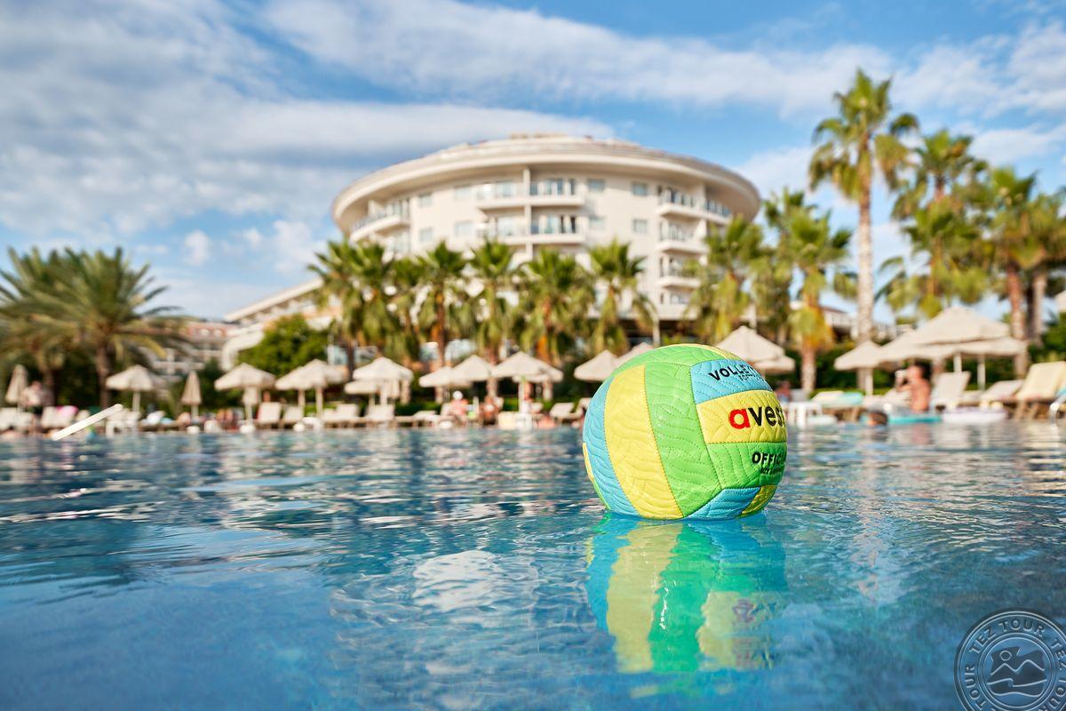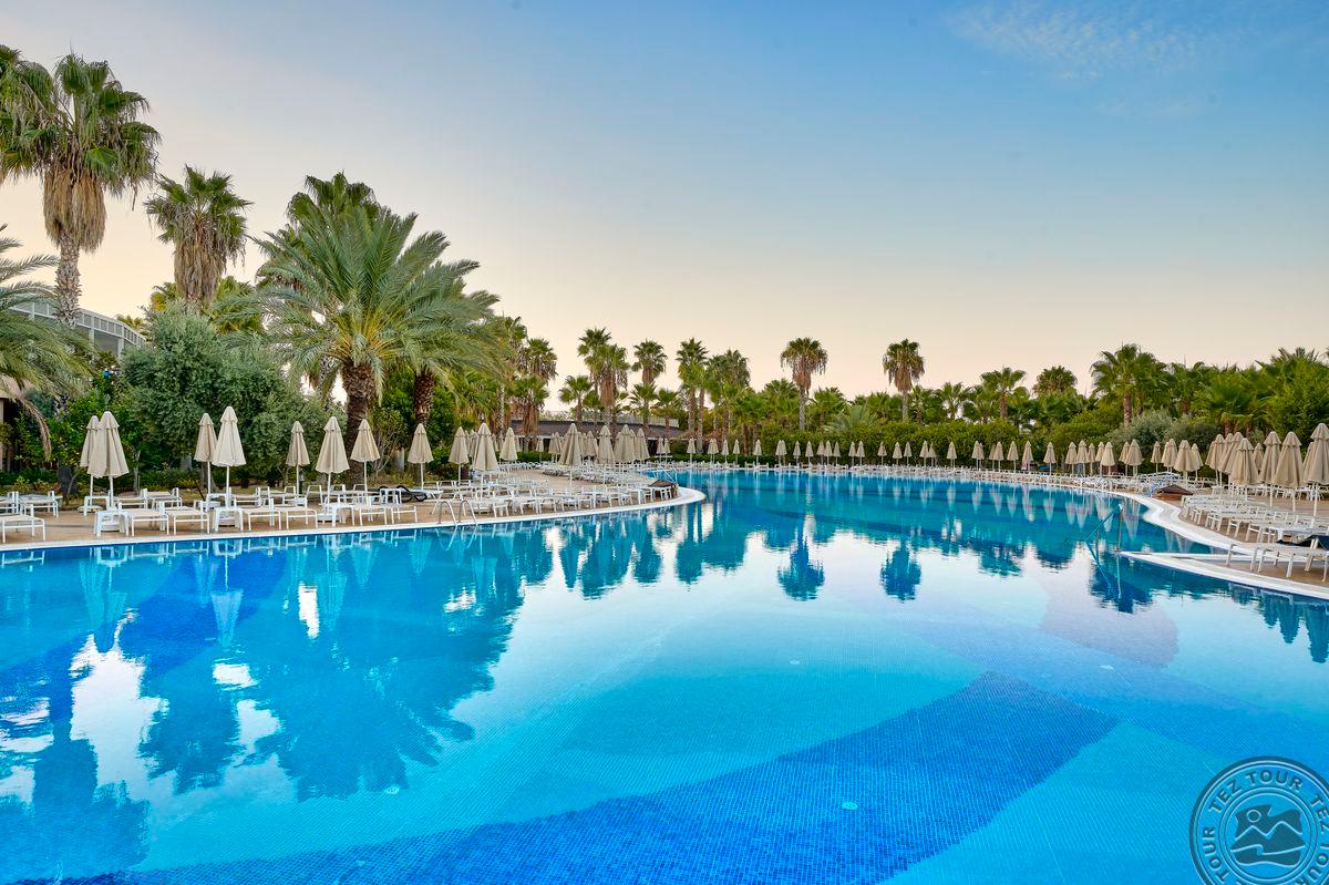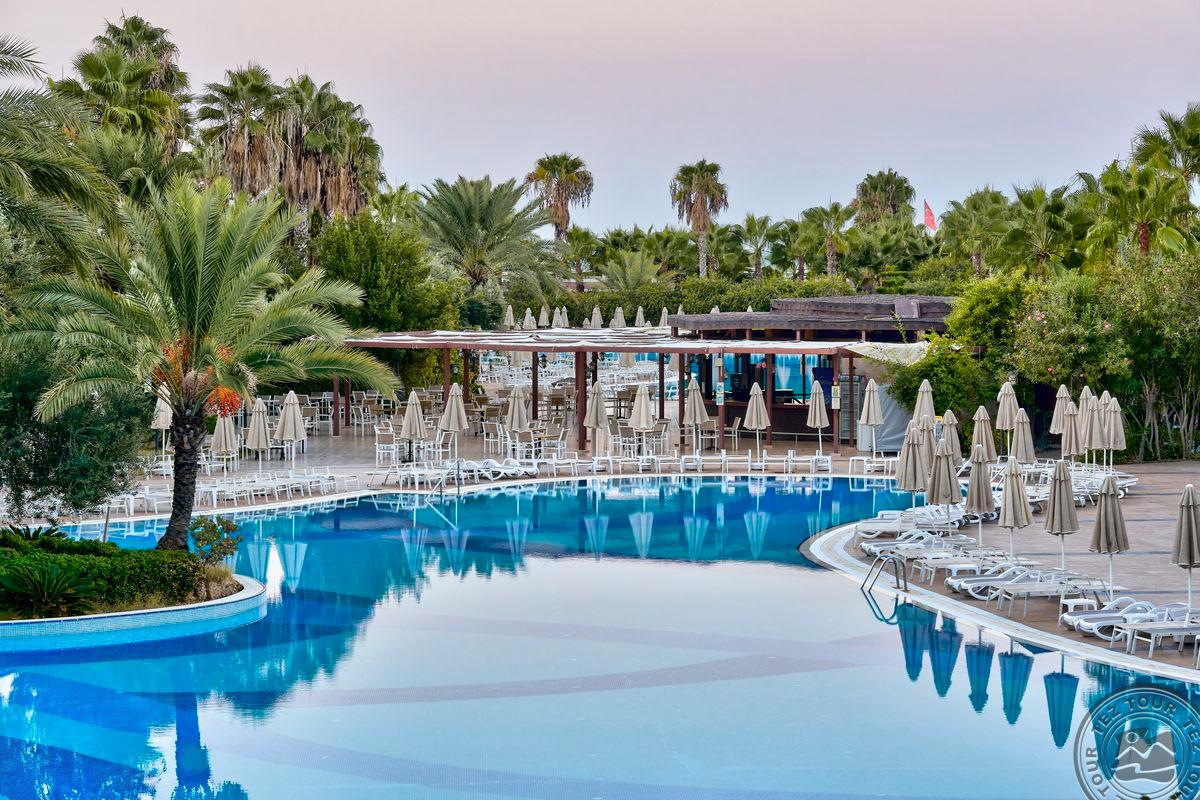 Территория:> рестораны: 1 (основной, есть вегетарианское питание) бары: 7 (один из баров работает 24 часа ) крытые бассейны: 1 бассейны: 3 (открытые) спа-центр (платно) конференц-залы: 4 (на 50–700 чел) у бассейна полотенца: бесплатно рестораны a la carte: 3 (османский, дальневосточный, итальянский - по предваительной записи, за неделю проживания посещение одного ресторана 1 раз – бесплатно) кабинет врача (в определенные часы, платно) кондитерская Wi-Fi бесплатно (на территории) Интернет-кафе платно прачечная платно у бассейна зонтики, шезлонги, матрасы: бесплатно парикмахерская (платно) магазины