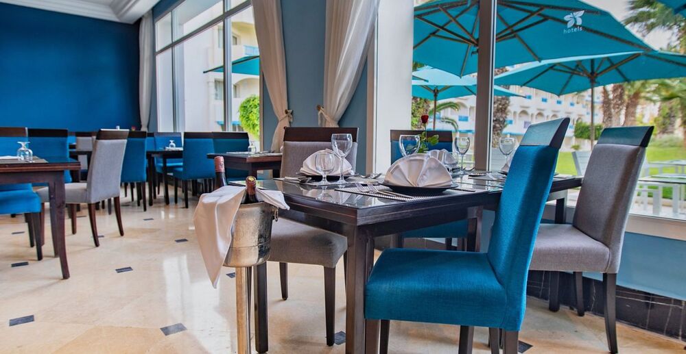 - РестораныLe Laurier (с 18:30 до 21:30) - a la carte, тунисская кухня (платно, одно бесплатное посещение за время пребывания в отеле по предварительной резервации за 48 часов)L’Olivier (с 18:30 до 21:30) - a la carte средиземноморская кухня (платно, только в летний период)Дополнительные услуги Open Space - обслуживание на открытом воздухе, в отелях Туниса, функционирует в период с 01.06 по 30.09