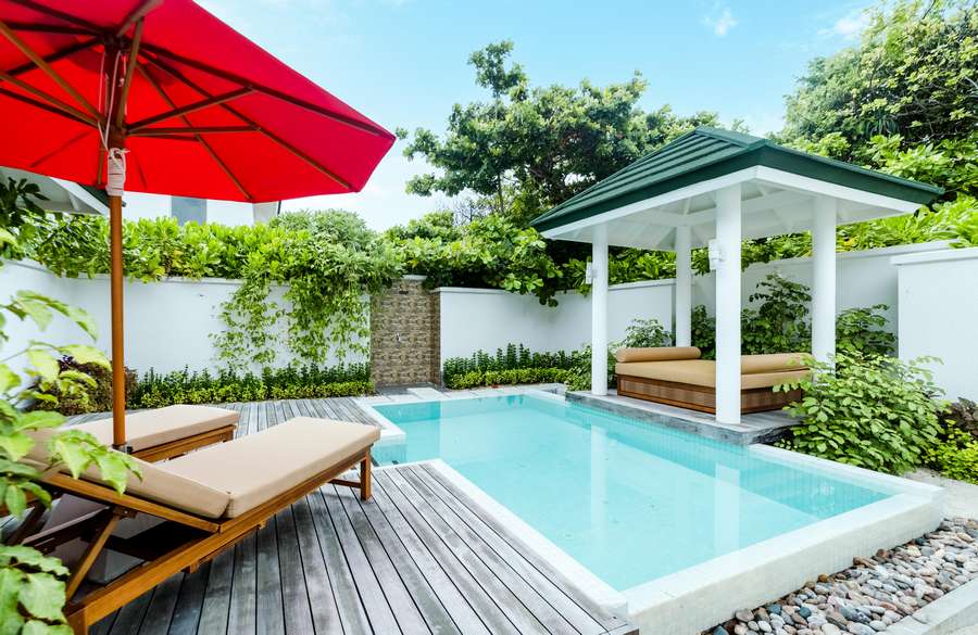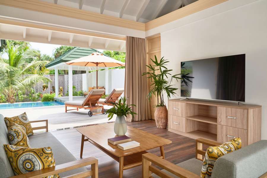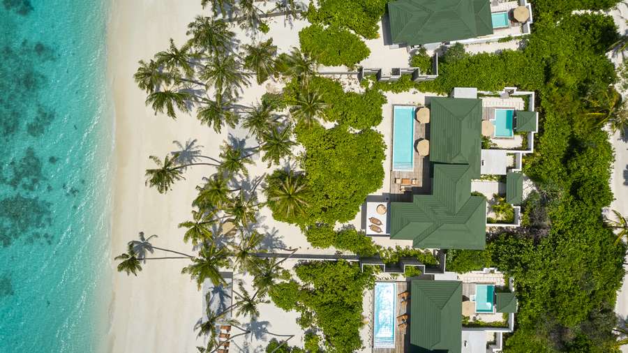 - (3) Three-Bedroom Pool Beach Villa (Общая площадь 645 кв.м, площадь виллы 346 кв.м) Пляжные виллы с 3 спальнями и бассейном расположены прямо на побережье с прямым выходом к кристально чистой лагуне – идеально для больших компаний и семей. На вилле: отдельная гостиная, 3 спальни, каждая спальня с ванной комнатой, зоны отдыха, просторная терраса и бассейн перед виллой.