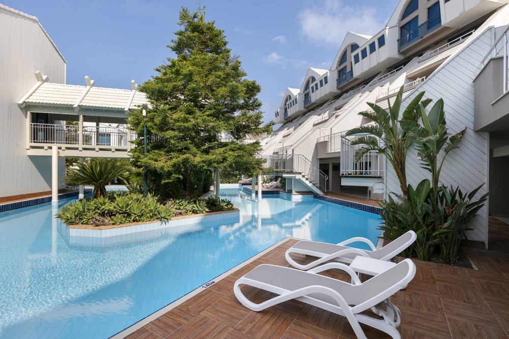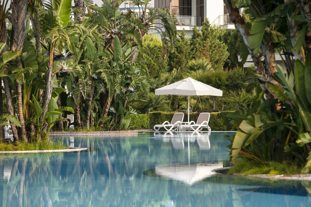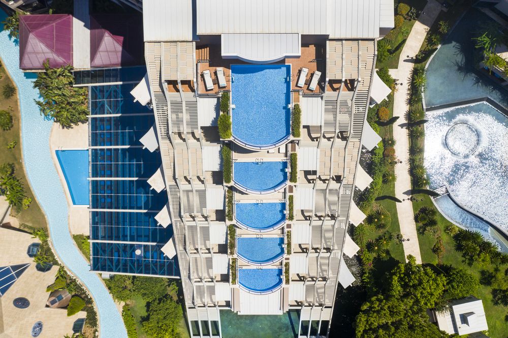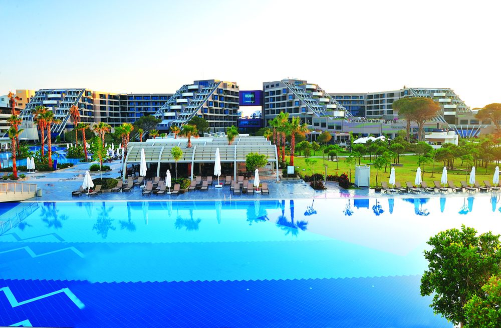 - Общее количество бассейновсемь. Пять открытых (один в секции озёрных домиков, один с горками, один с пальмами), два крытых (один полуолимпийский) с подогревом (время работы подогрева может меняться в зависимости от времени года, погодных условий и на усмотрение администрации отеля)Внимание! В зимний сезон открытые бассейны и водные горки не работают. Бассейн с пальмами и бассейн на террасе работают в зависимости от наполненности отеля и погодных условий