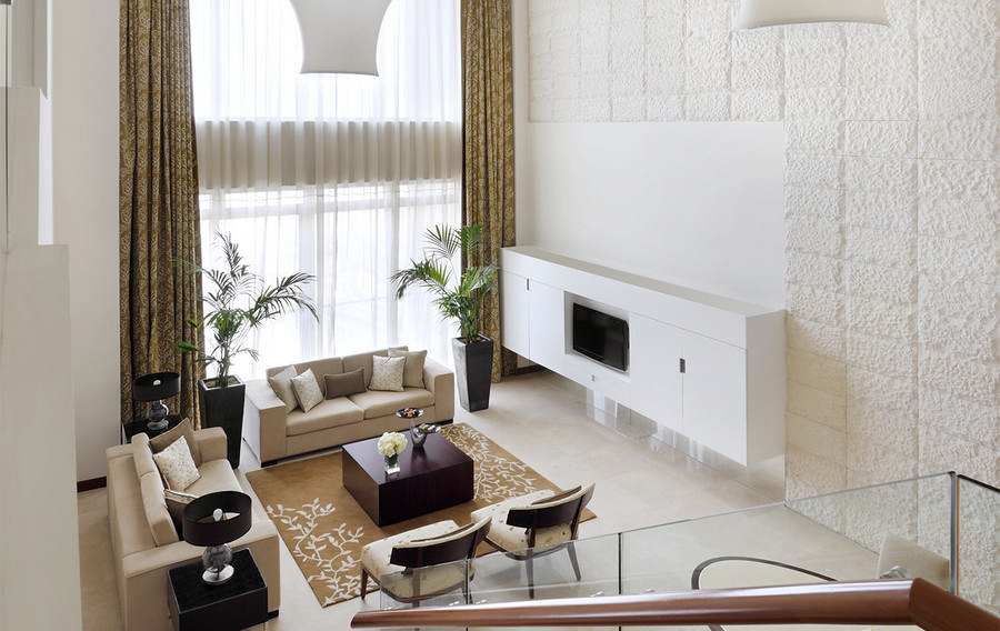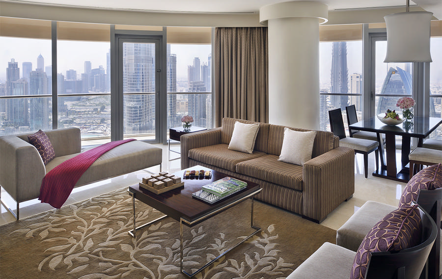 2 спальни с кроватями king и twin, просторная гостиная, столовая, кухня, 2 ванных комнаты, джакузи, балкон. Вид из номера на Burj Khalifa. Возможность коннекта с Club King Room, Эксклюзивный доступ в Club Lounge, трансфер на лимузине из/в Международный Аэропорт Дубая. Комплементарный валет-паркинг