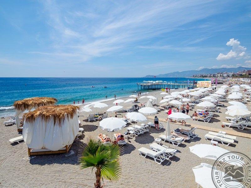 в 155 км от аэропорта г. Анталья, в 15 км от г. Алания, в 3 км от поселка Махмутлар, в 150 м по подземному переходу от собственного пляжа.