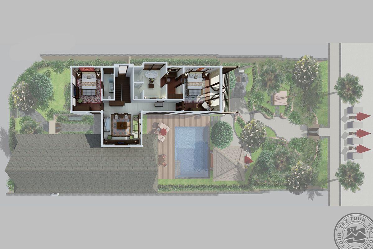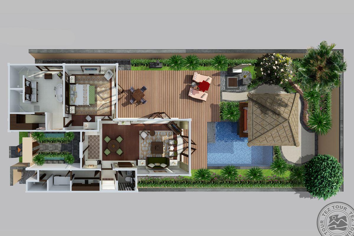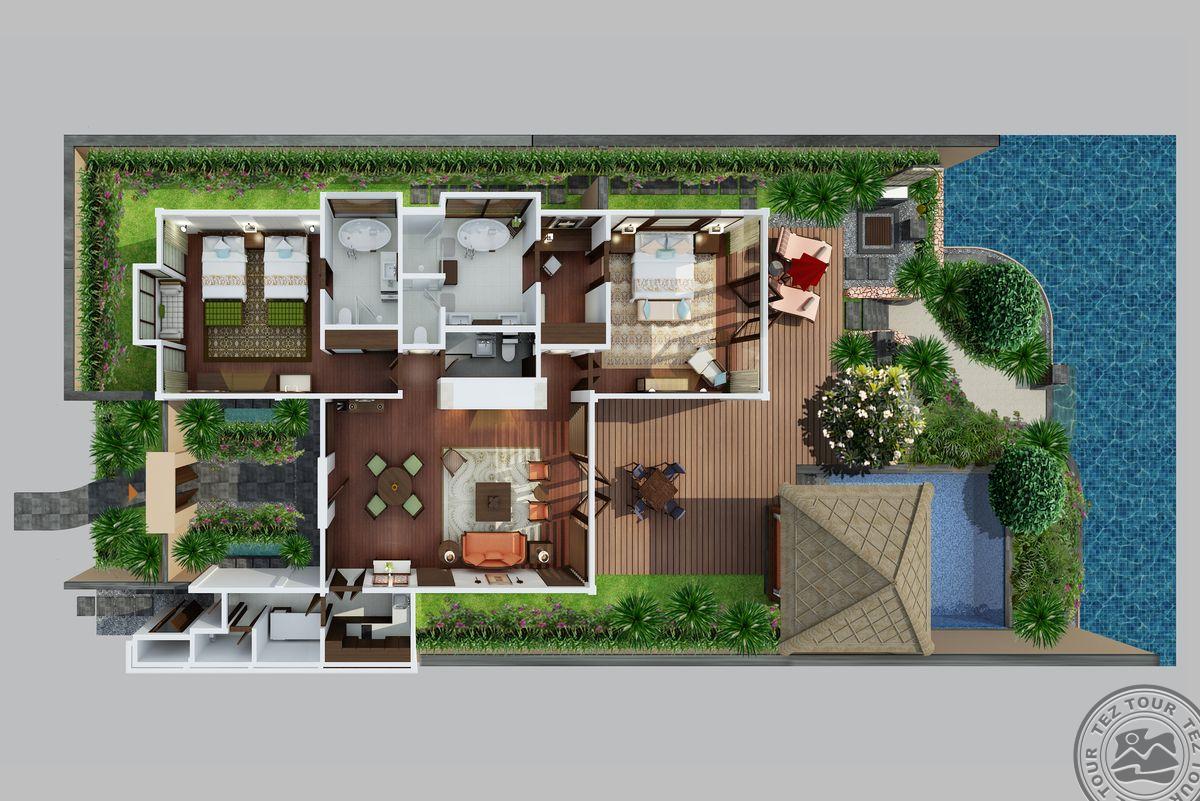 14 Pool Villa Suite (на первом этаже, вид на бассейн, спальня с зоной гостиной, двуспальная или 2 односпальные кровати, сад и частный джакузи-бассейн 10 м2, терраса, макс. 2+2 или 3 чел., 189 м2);