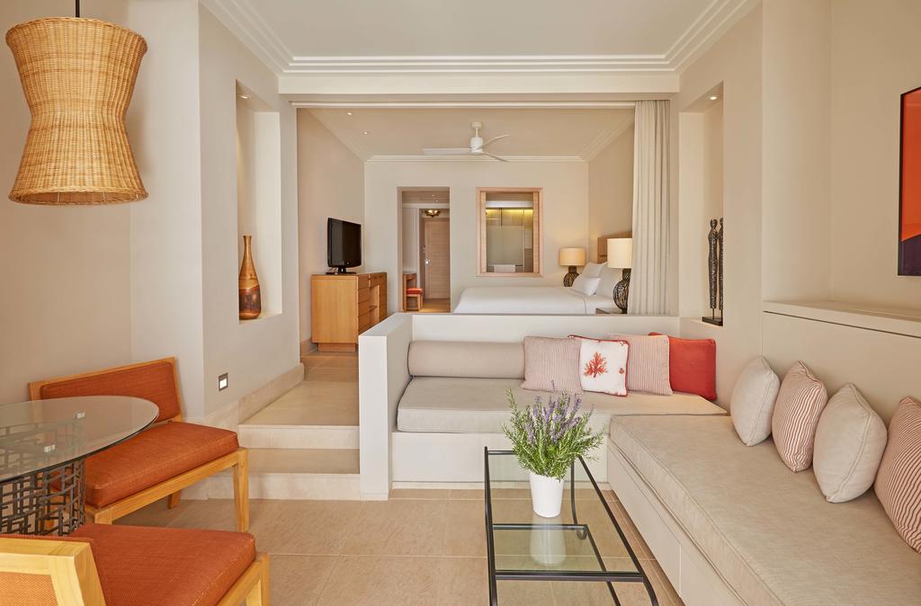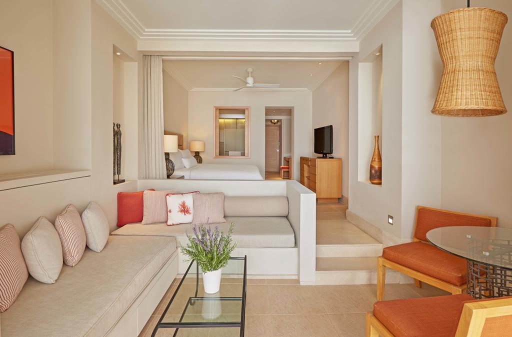 - Suite Family Resort/Garden View (~70-80 кв.м) Комфортная гостиная с зоной для отдыха и диван–кроватью, обеденной зоной и ванной комнатой, кофе-машина Nespresso, спальня с двуспальной кроватью и открытой ванной комнатой, отдельно стоящая ванна, терраса с видом на сады и бассейны курорта.
