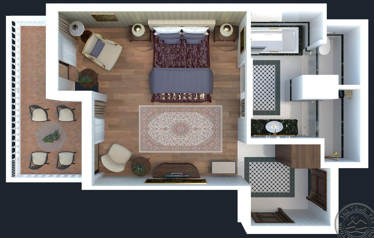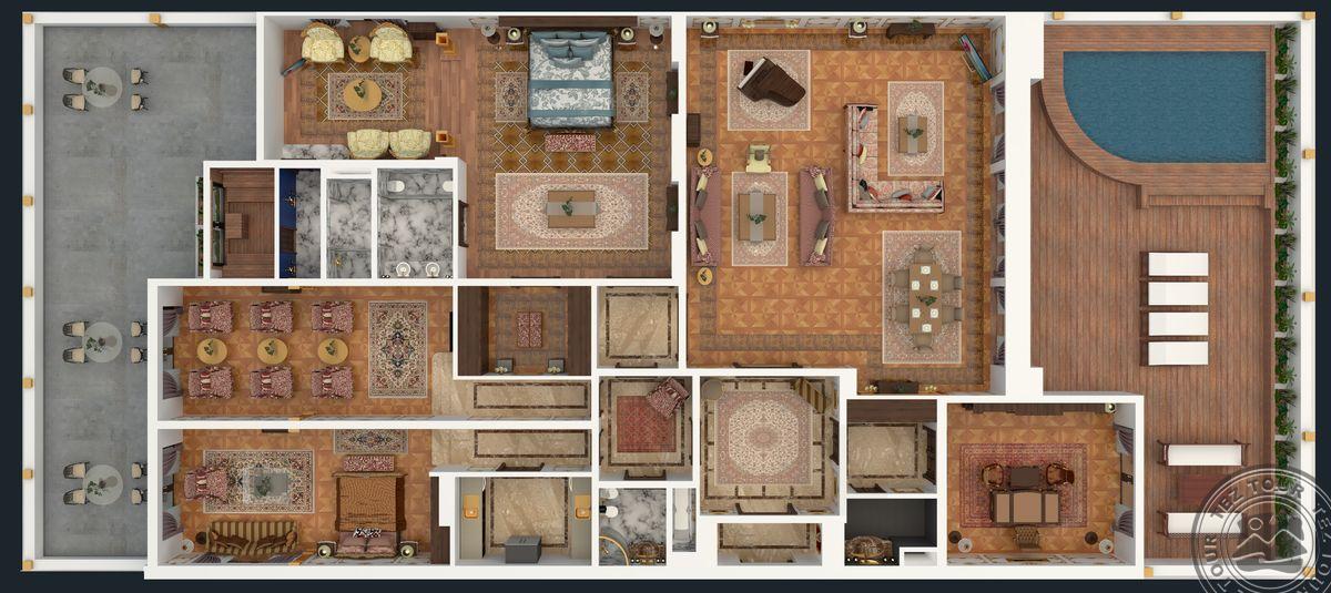 Premium pool duplex suite (на верхнем этаже 2 спальни с дверью, 2 ванные комнаты, на нижнем этаже – мини-кухня (мини-холодильник, обеденный стол; 22 м2 терраса с выходом к бассейну с шезлонгами, макс. 5+инф, 110 м2);